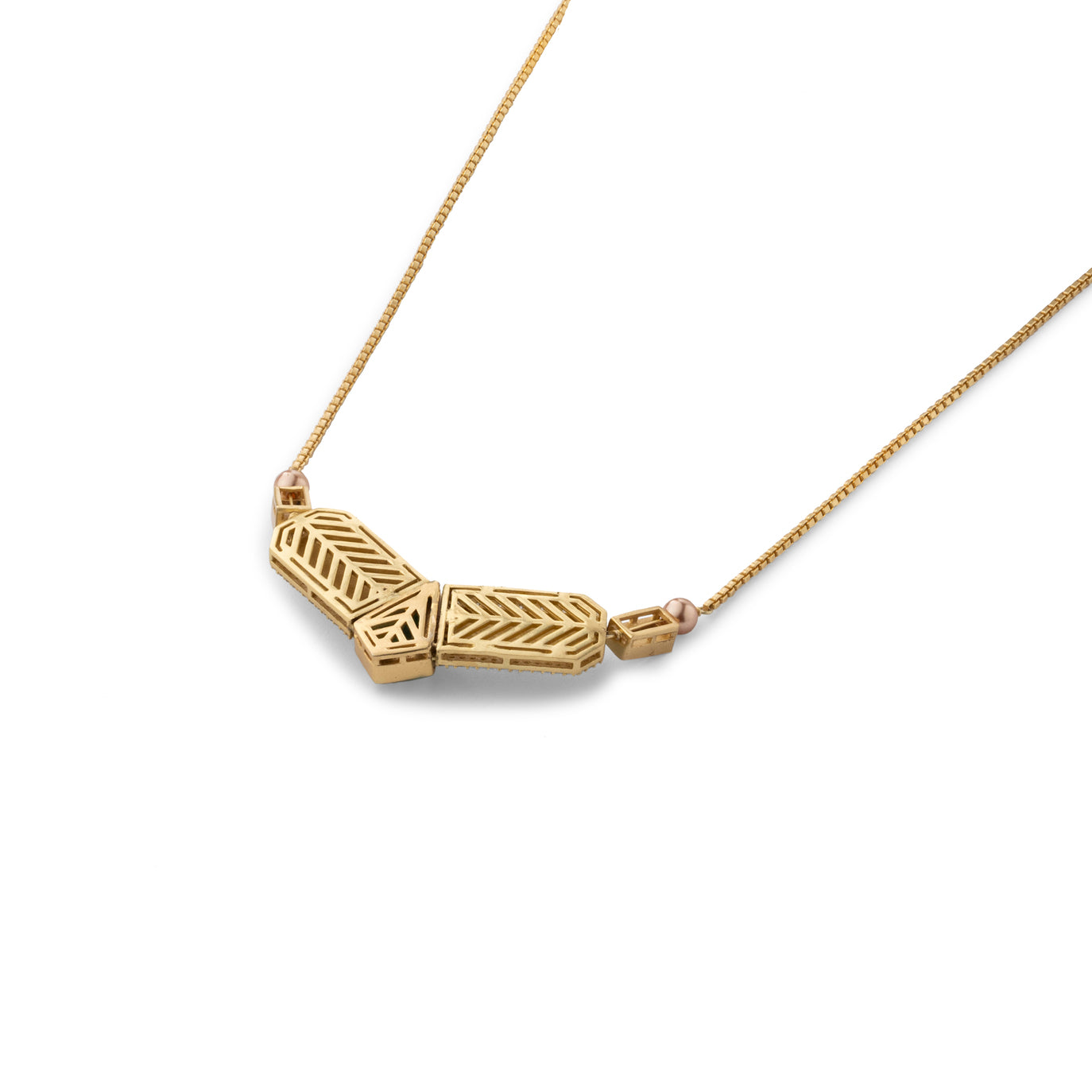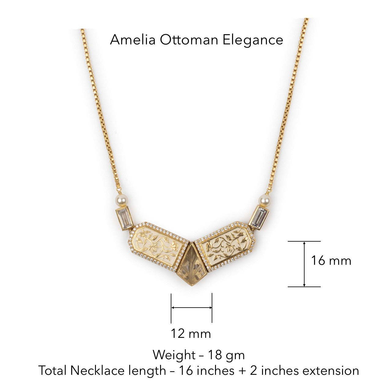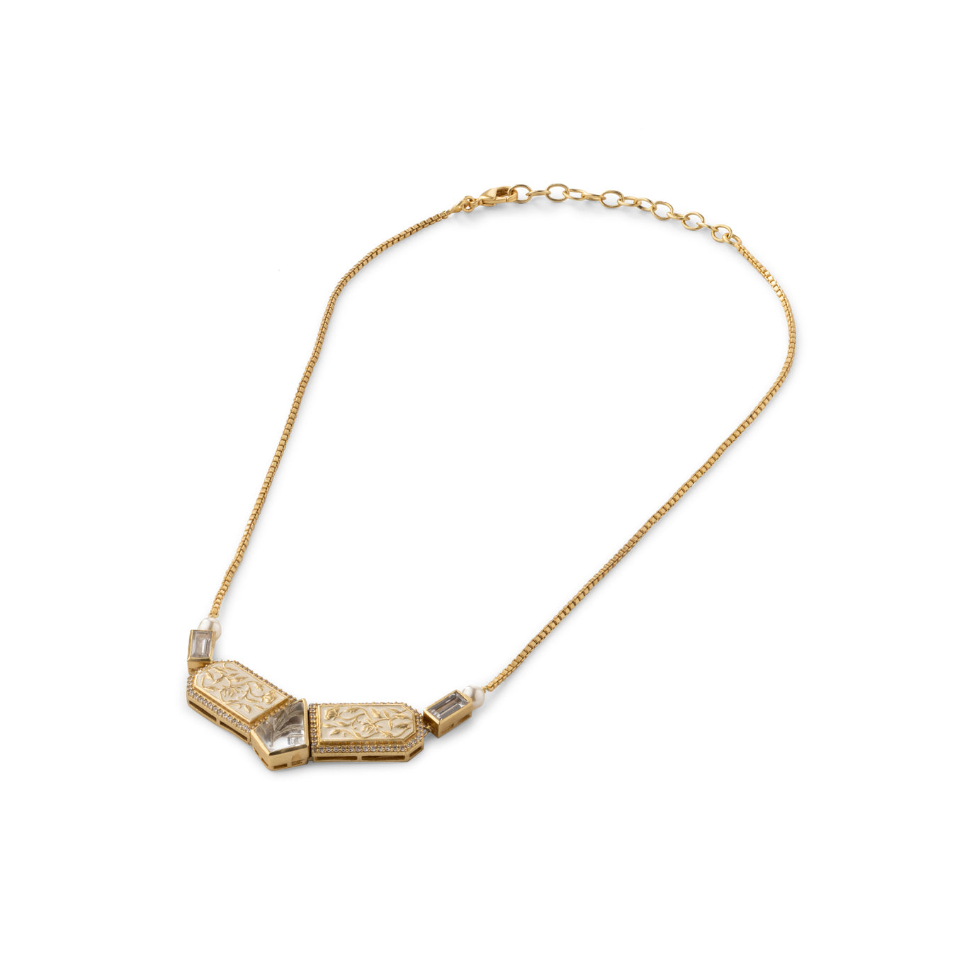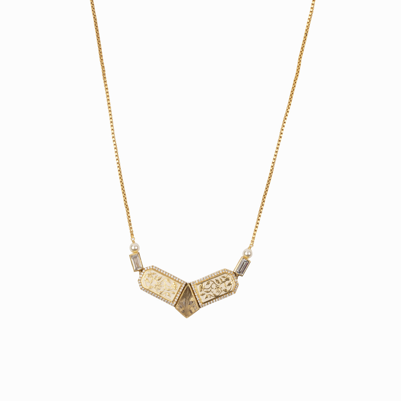 The striking symmetry of this architectural necklace is accentuated by the unexpected combination of carved semi-precious stones and high-grade zirconia set in enamel.