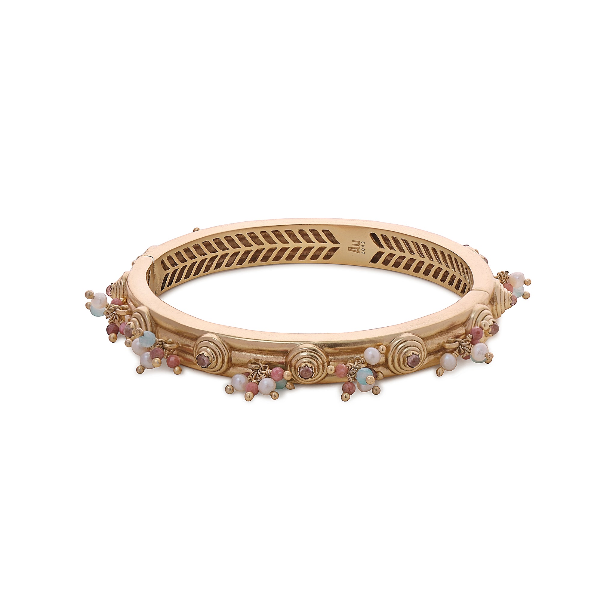 Handpicked amazonites, rhodochrosites, and Swarovski pearls juxtaposed with the designer's signature couture sensibilities has given birth to this exquisite wristwear. A cleverly concealed clasp ensures ease of wear while the design remains fluid.