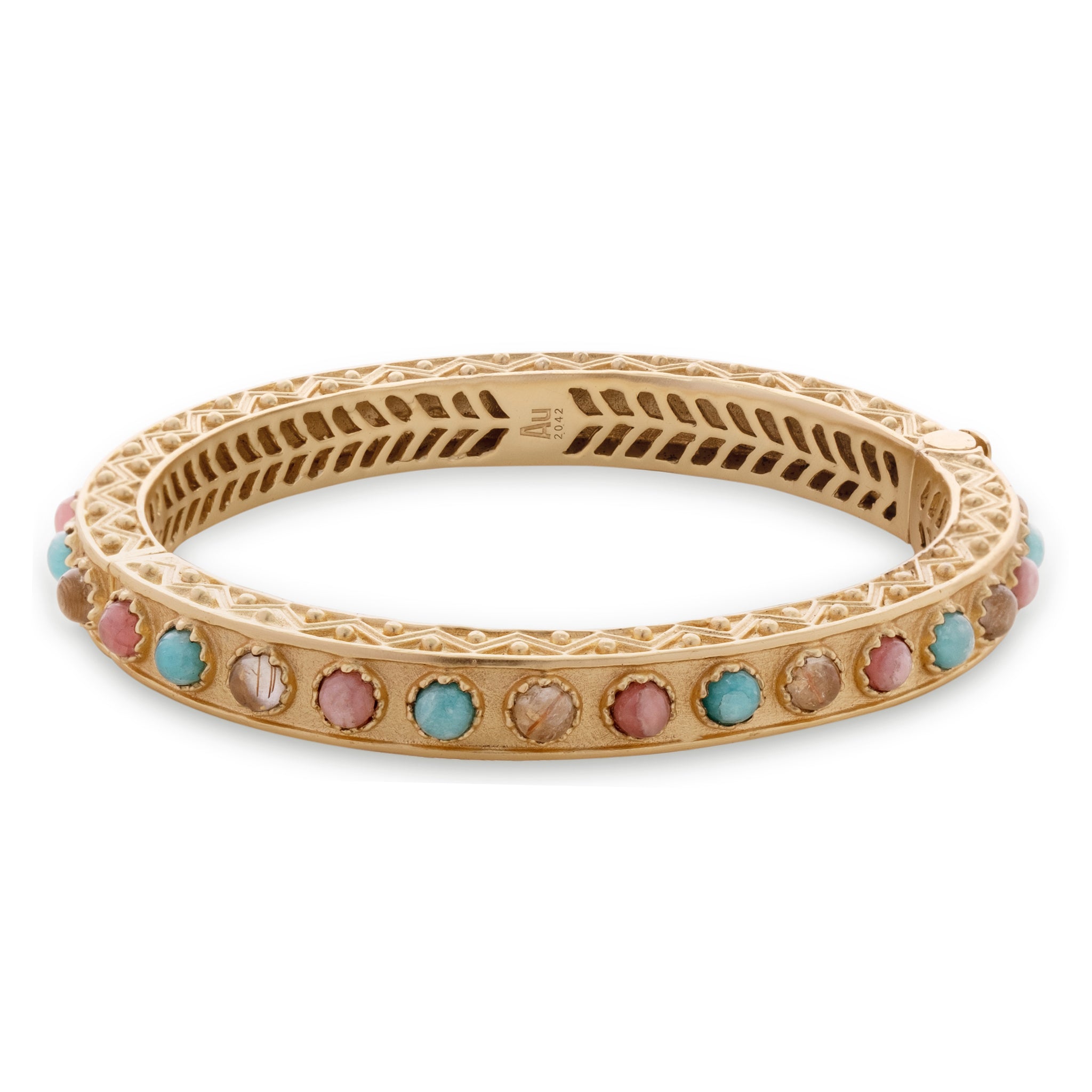 Handpicked amazonites, golden rutiles, and sun stones juxtaposed with the designer's signature couture sensibilities has given birth to this exquisite wristwear. A cleverly concealed clasp ensures ease of wear while the design remains fluid.