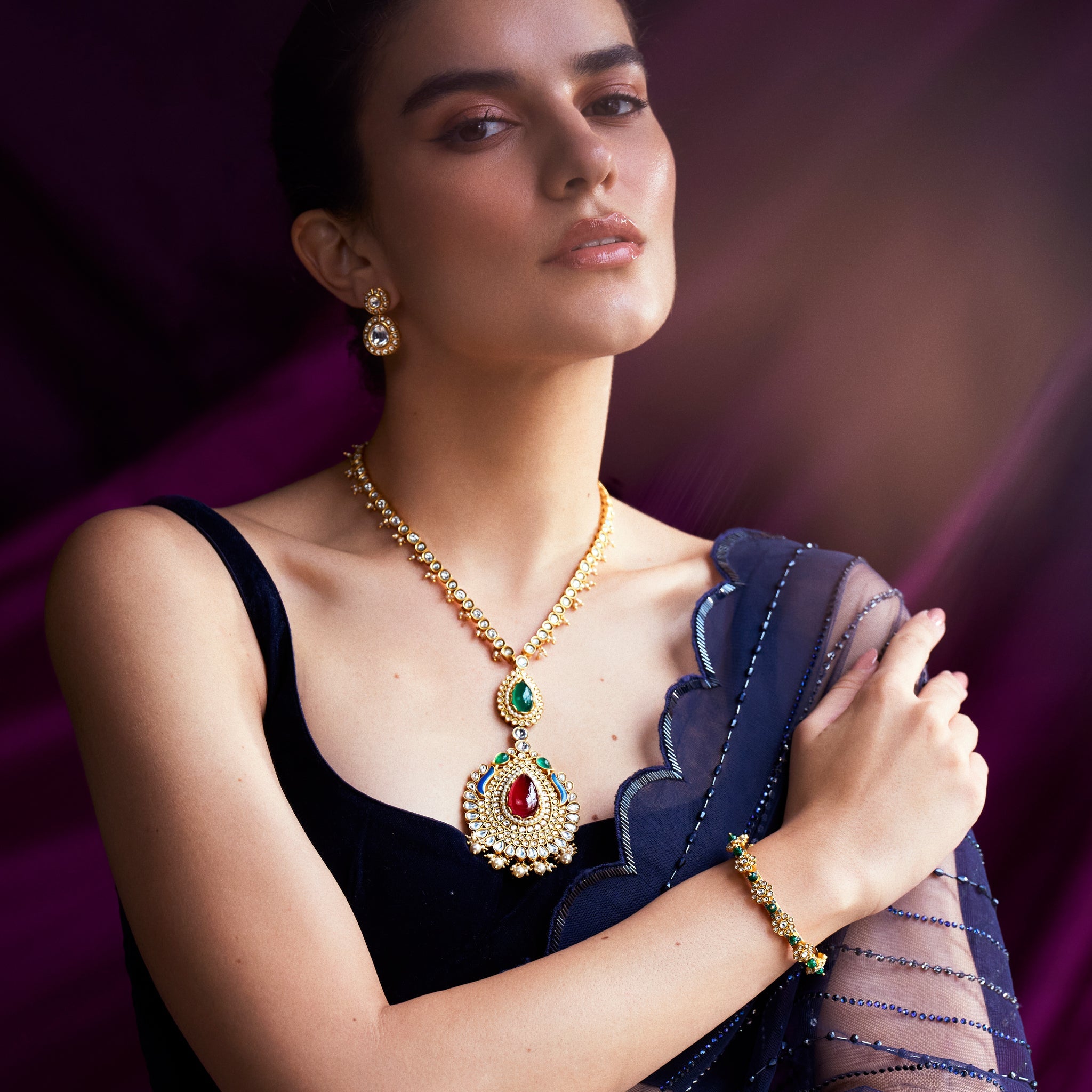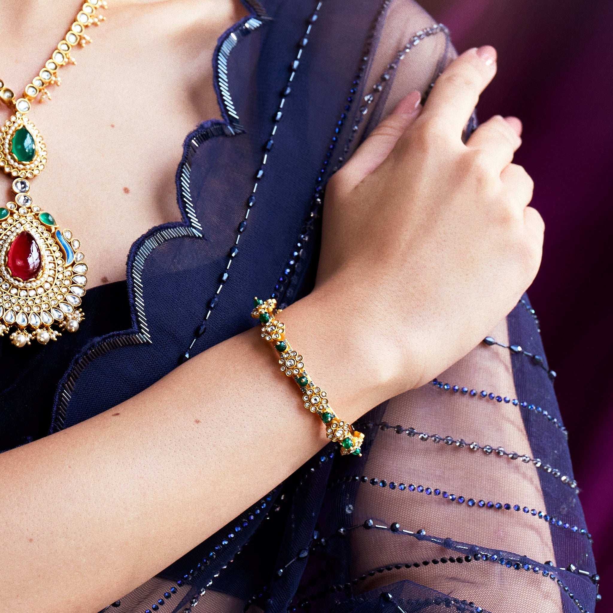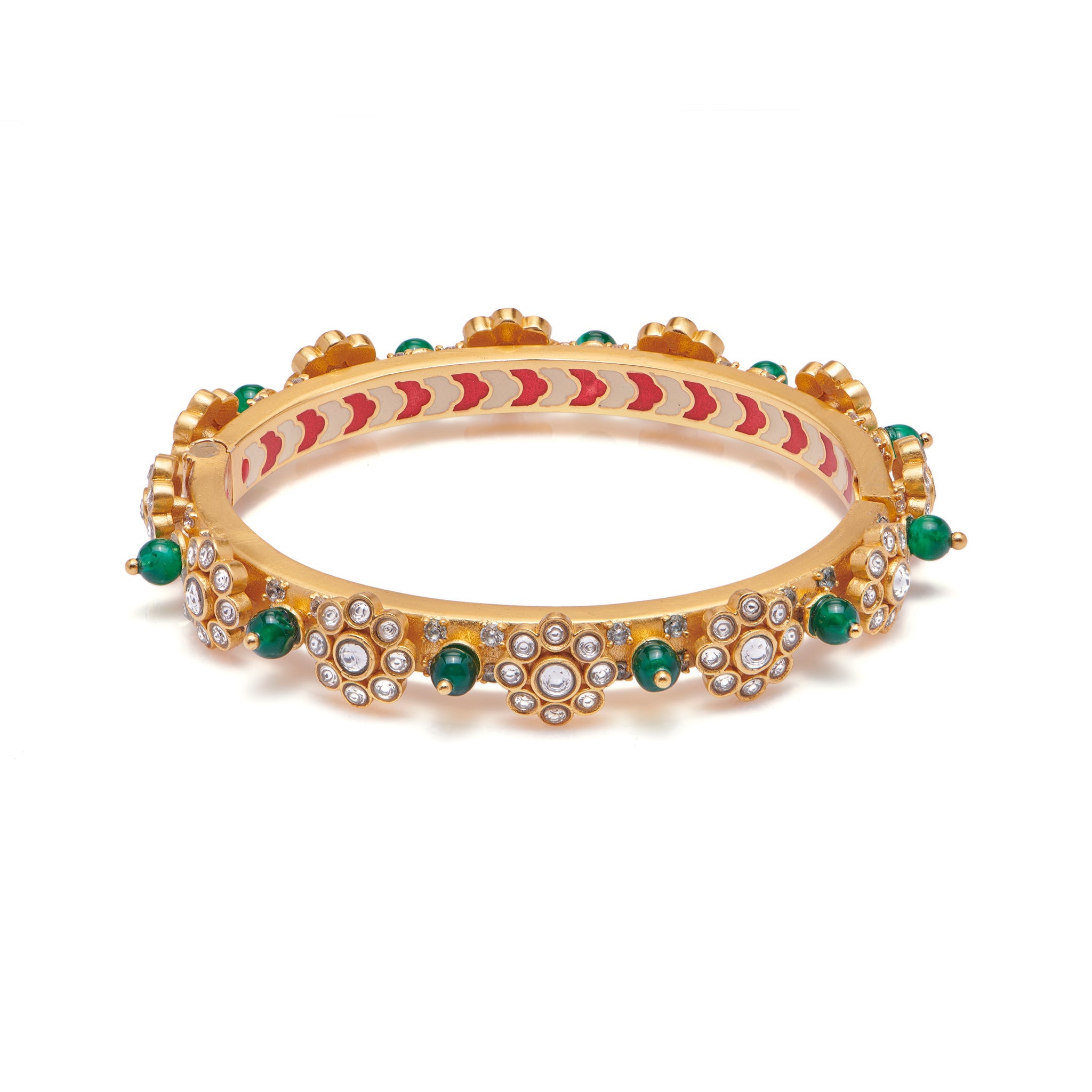 An array of striking semi-precious stones with intriguing hues were handpicked to create this statement bangle. The intricate floral motifs cast a delicate silhouette, making this wrist-wear perfect for all kinds of special occasions.