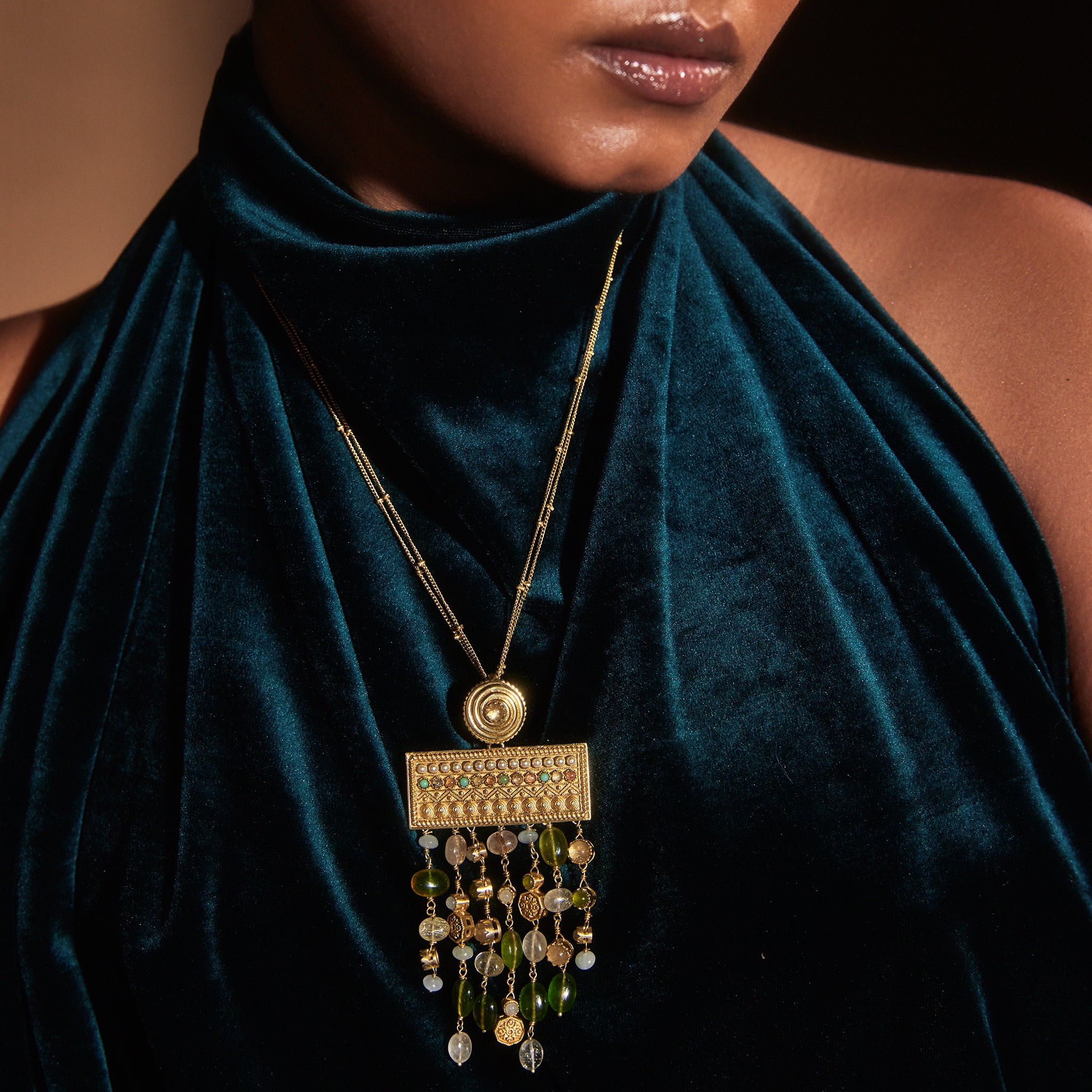 The EssenceHandpicked amazonites, black rutiles, sun stones, green jades, aquamarines, golden rutiles, and Swarovski pearls have been strung together in a symphonic manner to give birth to this iconic necklace. Consciously MadeYou are avoiding the generation of approximately 68,800 kg of toxic waste & 1,200 kg of CO2 emissions, that mining gold for this jewel would have caused.