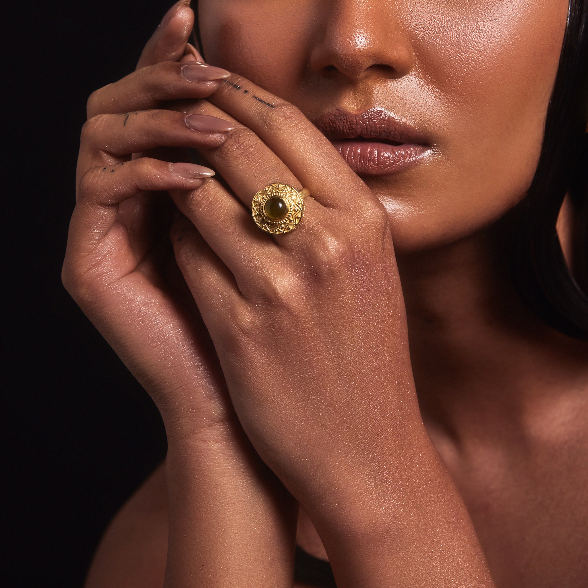 The Essence This archetypal ring brings forth a vintage design aesthetic to life with a decadent green jade stone set on a richly-carved golden disc. Consciously Made You are avoiding the generation of approximately 11,000 kg of toxic waste & 200 kg of CO2 emissions, that mining gold for this jewel would have caused.