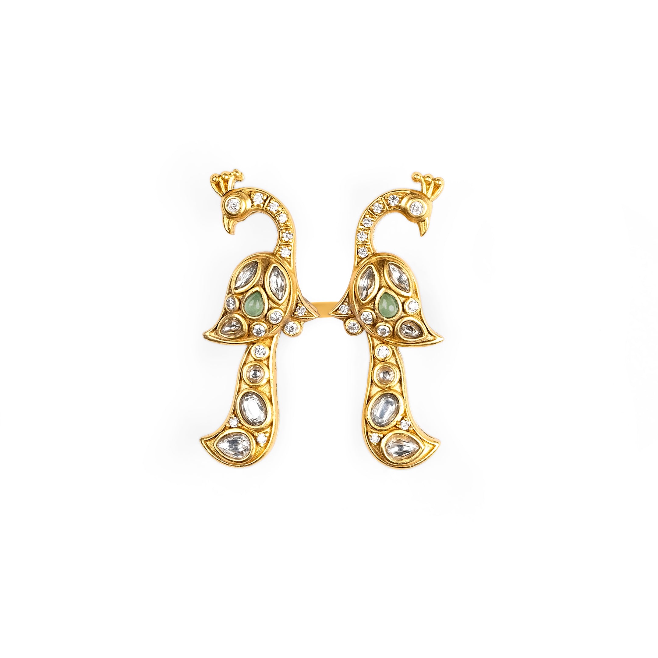 Inspired by the meticulous detailing of Mughal miniature artworks, this ring features dual peacock motifs nestled within rich Kundan work.