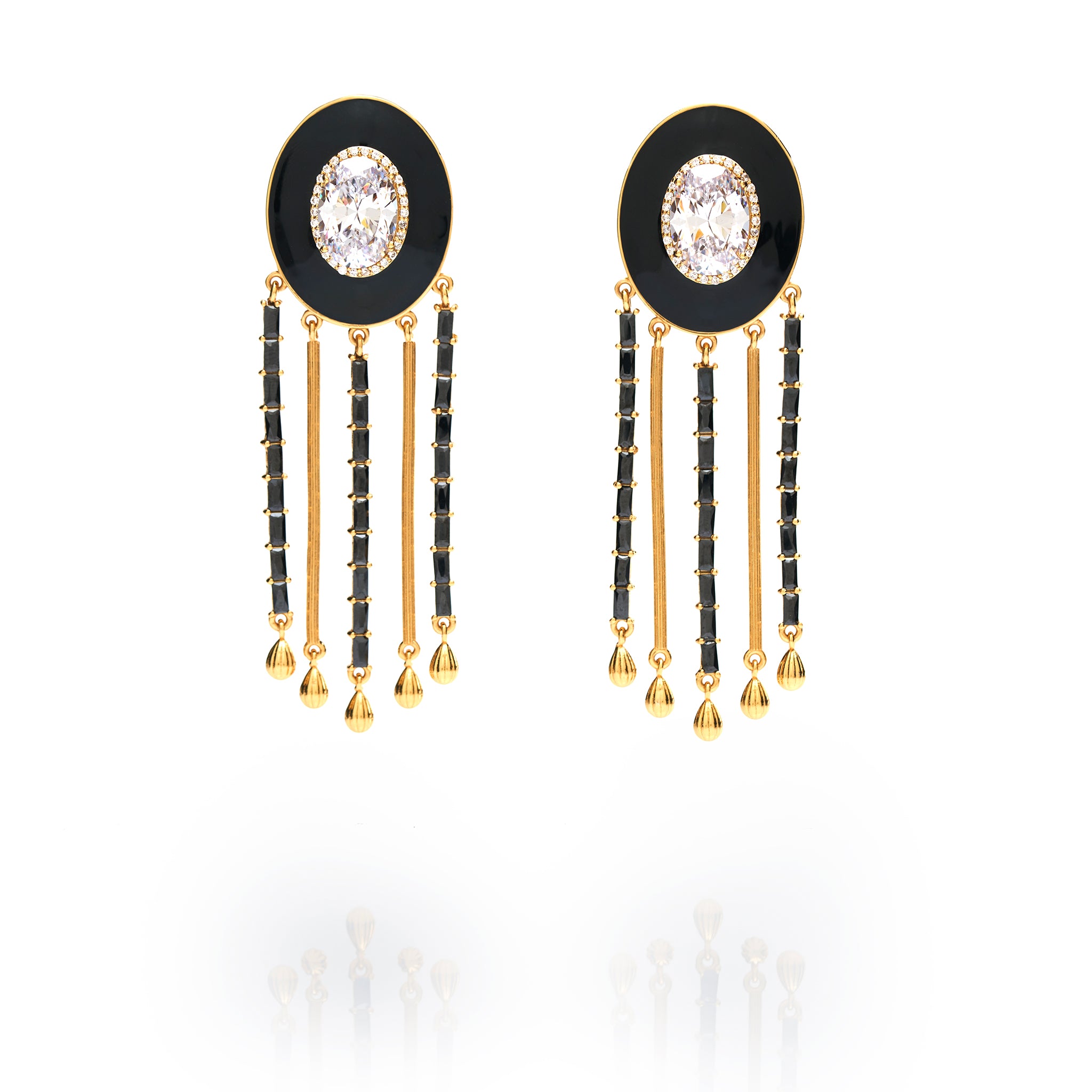 An edgy depiction of fringe earrings, this statement pair redefines cool classiness. Crafted with sparkling high-grade zirconia stones, and coupled with enamel work -- this pair emancipates a noir vibe.