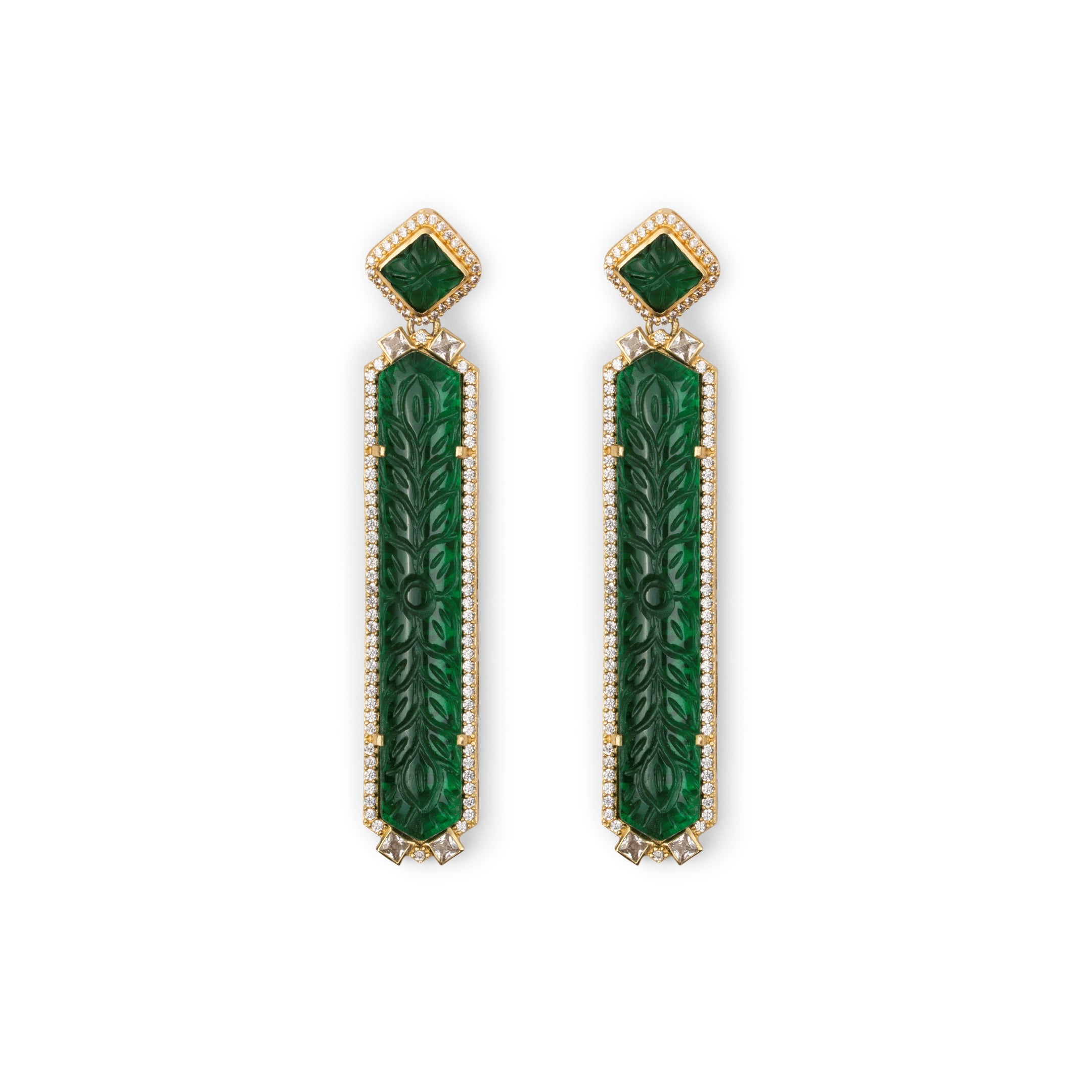 Elegant Art Deco-inspired drop earrings, featuring hand-carved semi-precious stones, add a touch of sophistication to any outfit.