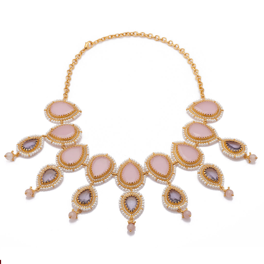 The serenity of wild lavender-tinged tear-drop semi-precious rose quartz stones and delicate Swarovski pearls are strung together in perfect harmony.