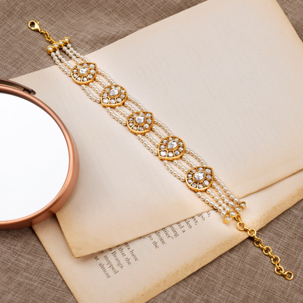 Embodying the grace and opulence of Mughal fabrics, this bracelet woven with Swarovski pearls and paisley motifs with semi-precious stones, drapes the wrist of the wearer with the fluidity of soft silks.