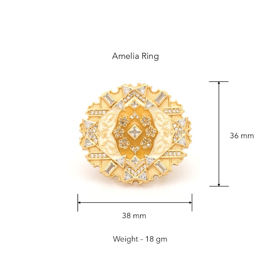 This archetypal ring epitomizes a maze-like silhouette with the employment of high-grade zirconia stones set on rich enamel work.