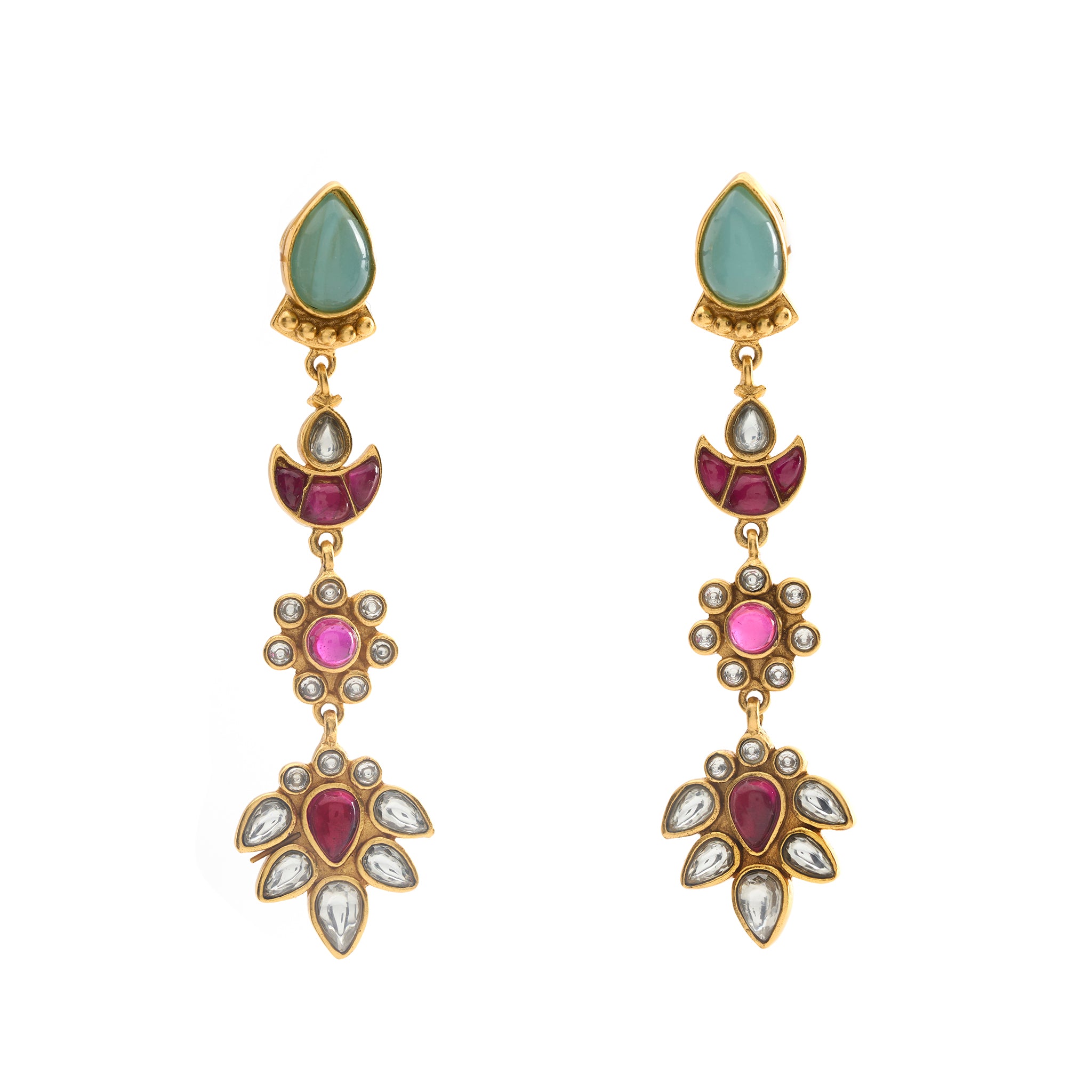 These dainty floral motifs studded with lush crimson stones, unfaceted high-grade zirconia, dangle from Cerulean Haze semi-precious stones, reminding us of vibrant hues of summertime.