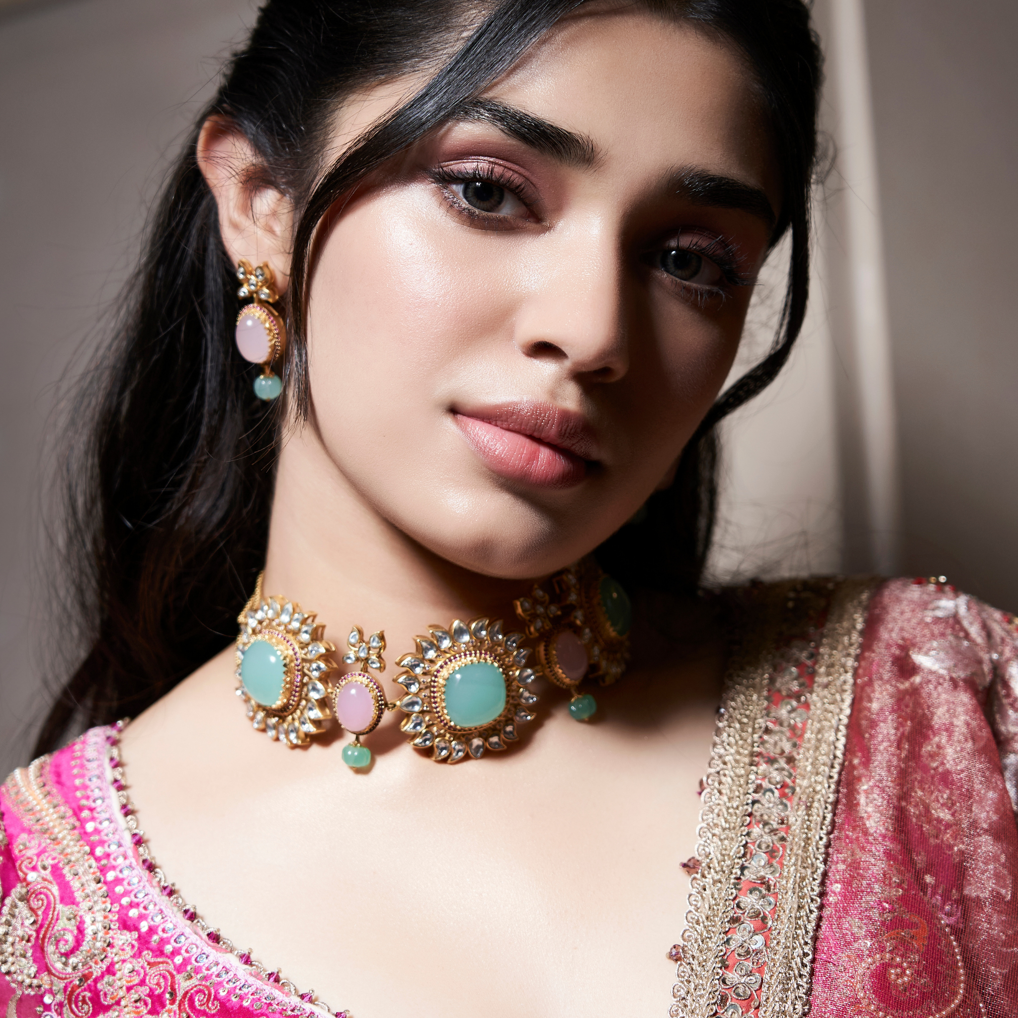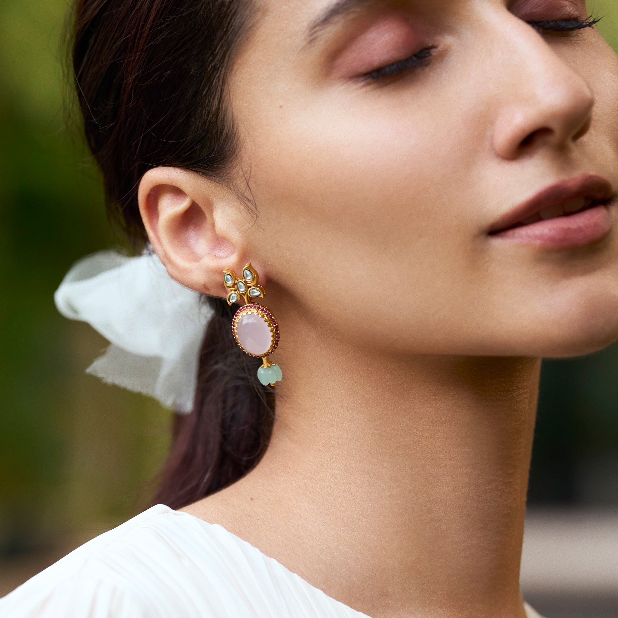 Dipped in pastel hues, the drops are an ethereal composition of unfaceted zirconia and semi-precious haze-toned stones put together with flaming fuchsia and vintage blush toned stones.