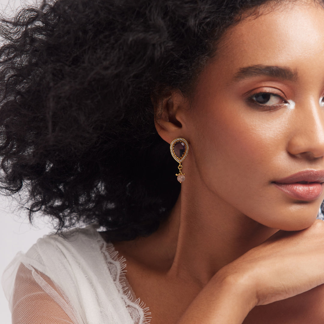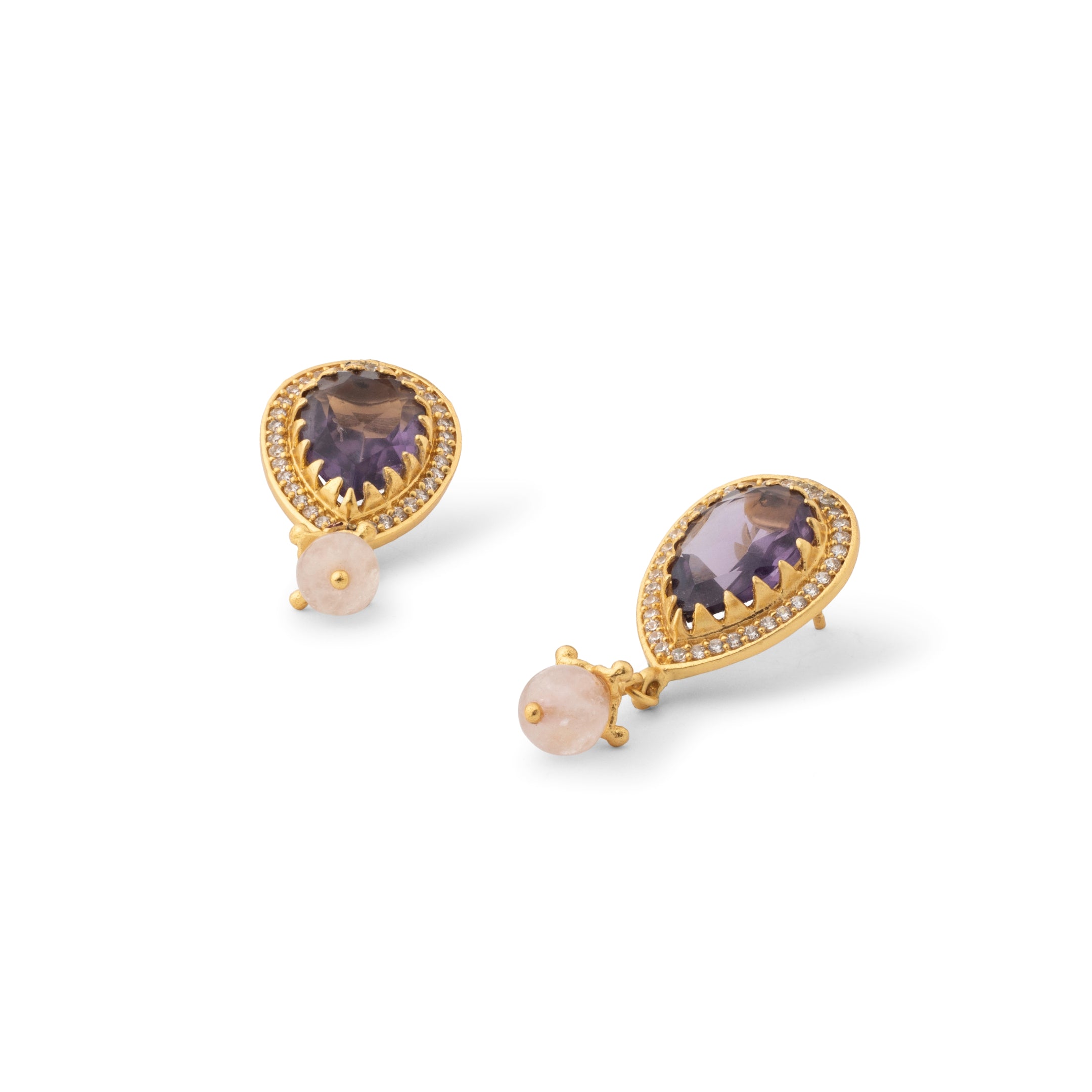 An elegant pair of earrings featuring tear-drop-shaped semi-precious stones in soft lavender hues, accented with high-grade zirconia.