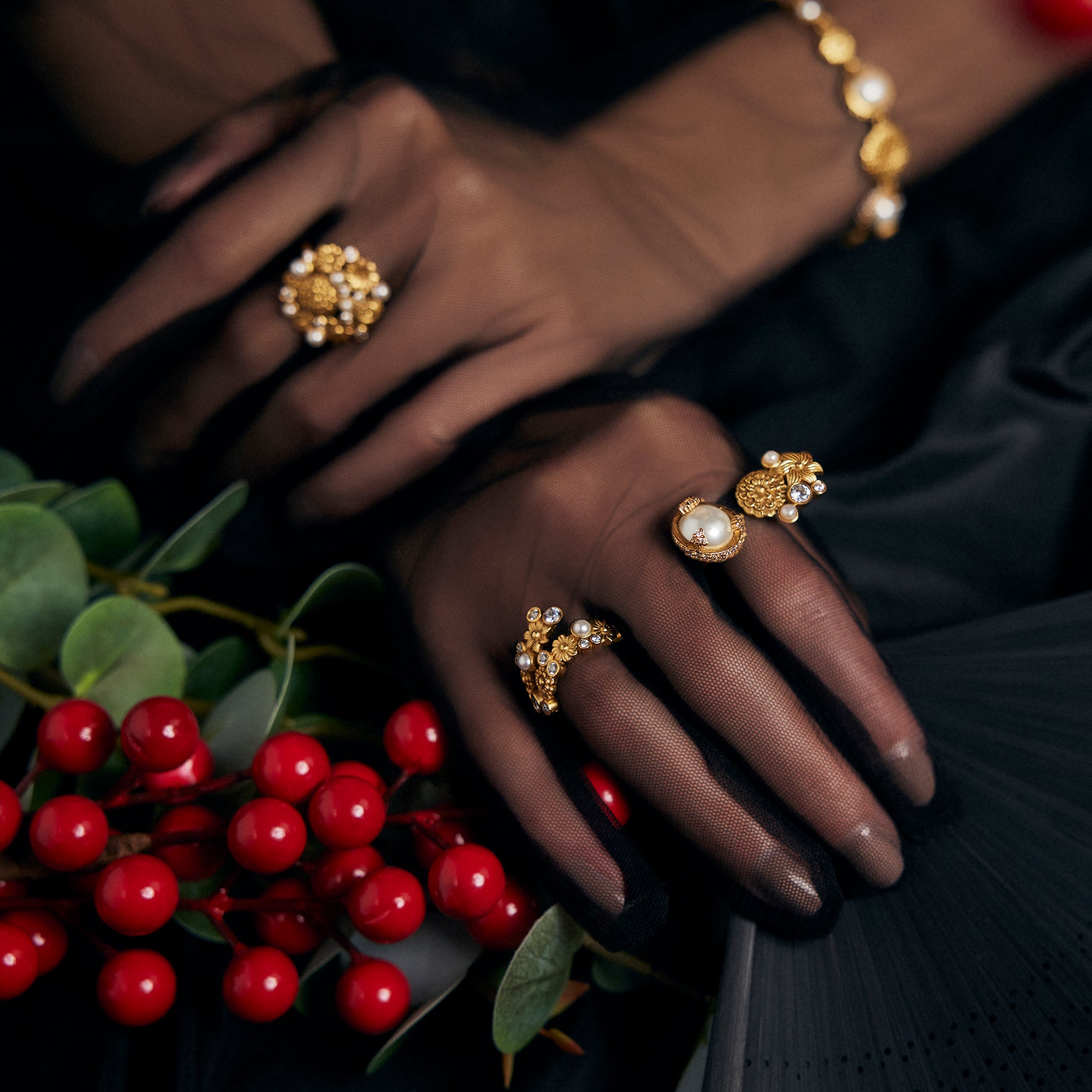 A stylish blend of classic and contemporary design vocabulary--this wrap-around ring is crafted with sparkling high-grade zirconia stones, Swarovski pearls. Its design is both sleek and innovative, featuring a band that wraps around the finger with fluid grace, creating a visually captivating and unique silhouette.
