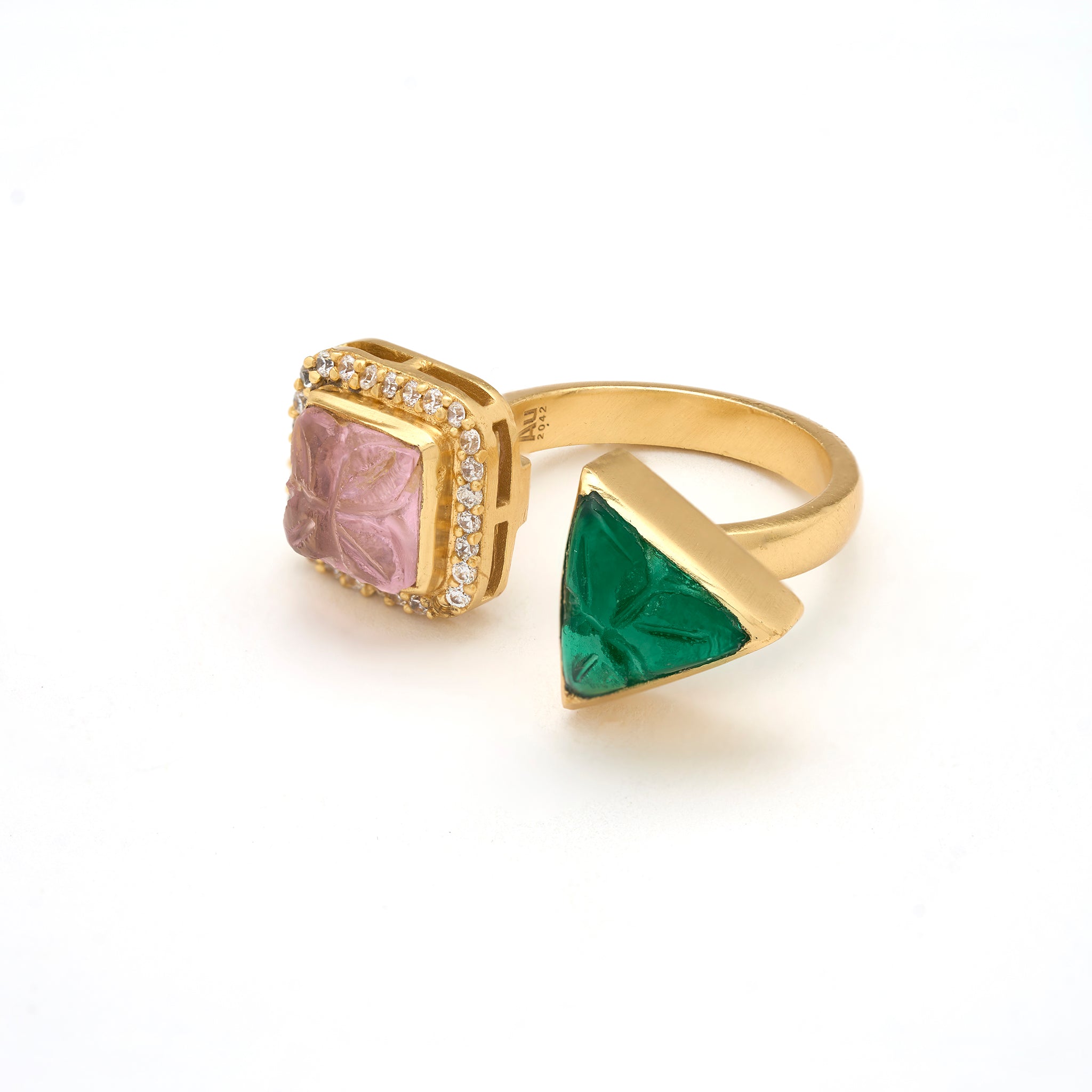 This in-between finger ring made with blush and green toned carved semi-precious stones evokes a sense of old-world charm.