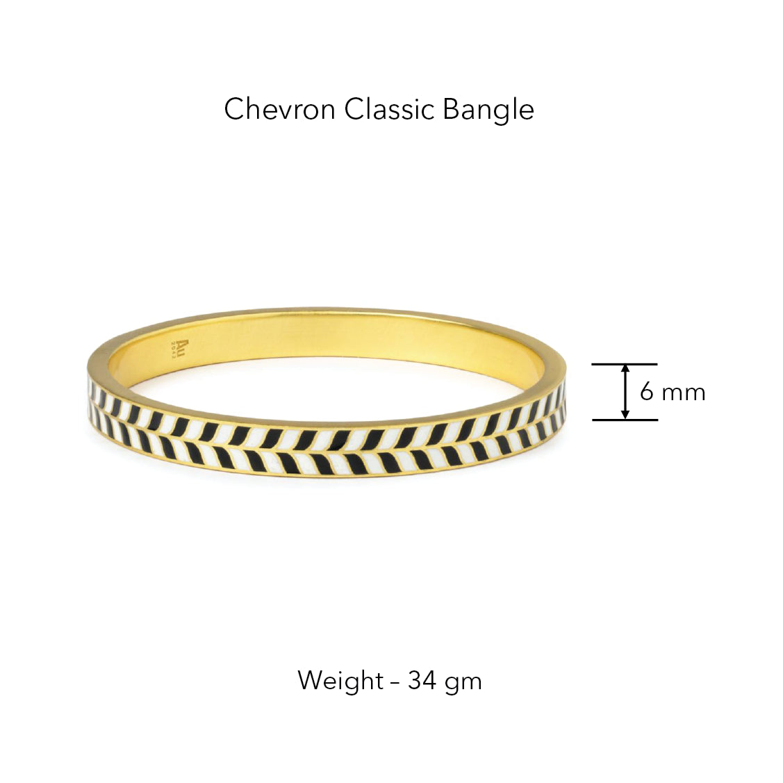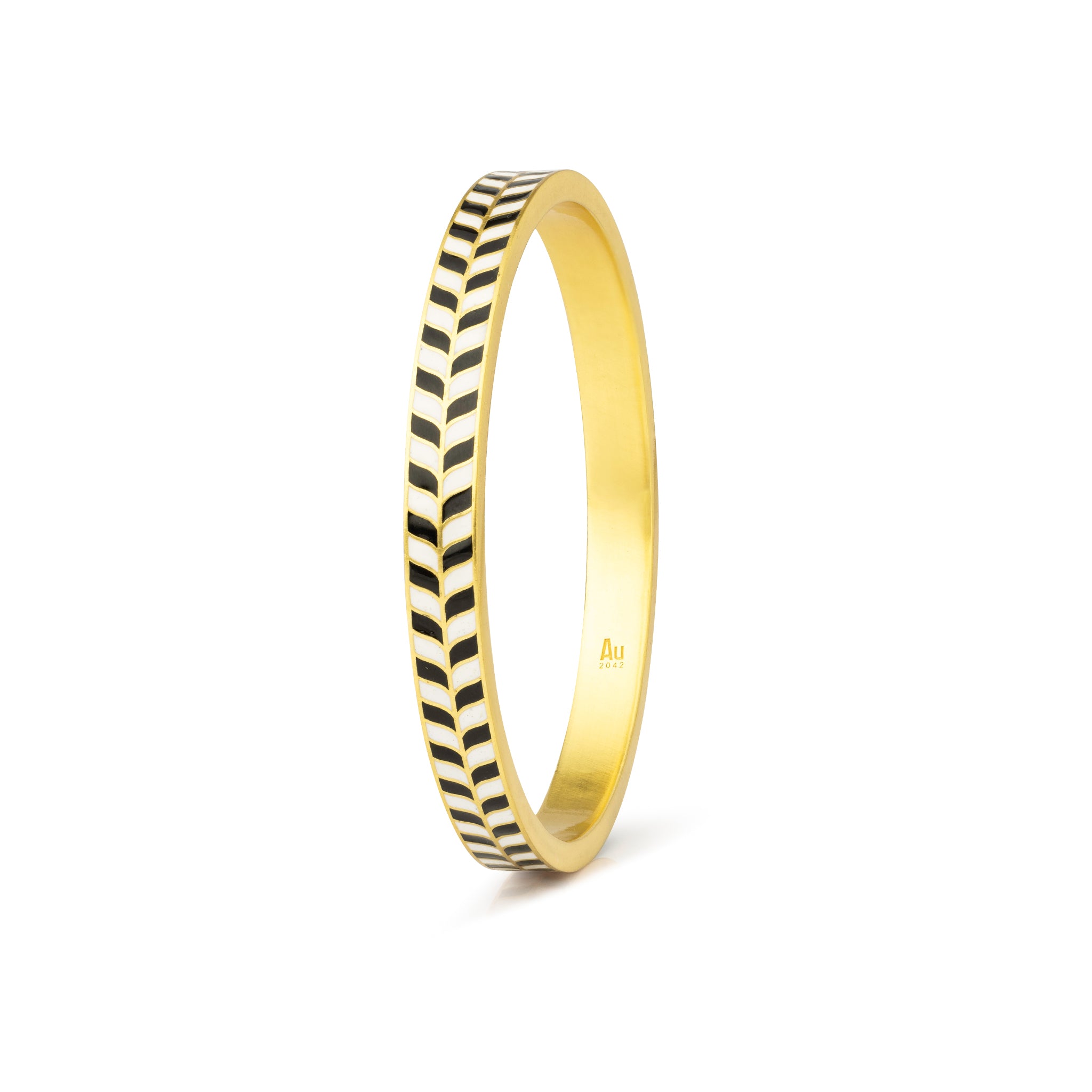 This captivating bangle is the perfect way to elevate your everyday style with a touch of timeless elegance. Featuring a linear pattern of matte, golden enamel chevrons, meticulously arranged in a row, it exudes a classic and sophisticated vibe that never goes out of style.
