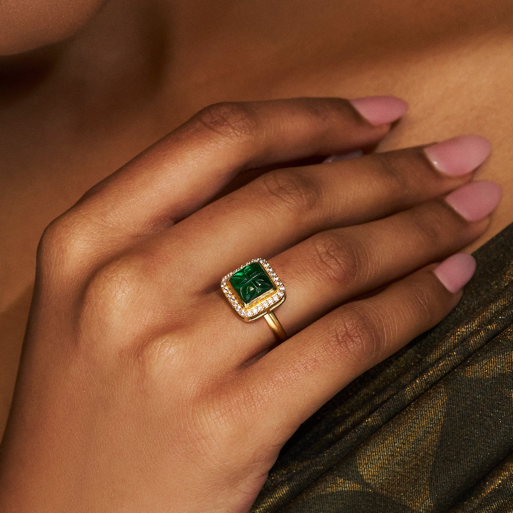 This ring depicts figments from the iconic Art Deco style language. The rich green carved center semi-precious stone dotted with glittering high-grade zirconia stones adds to the regality of the jewel.