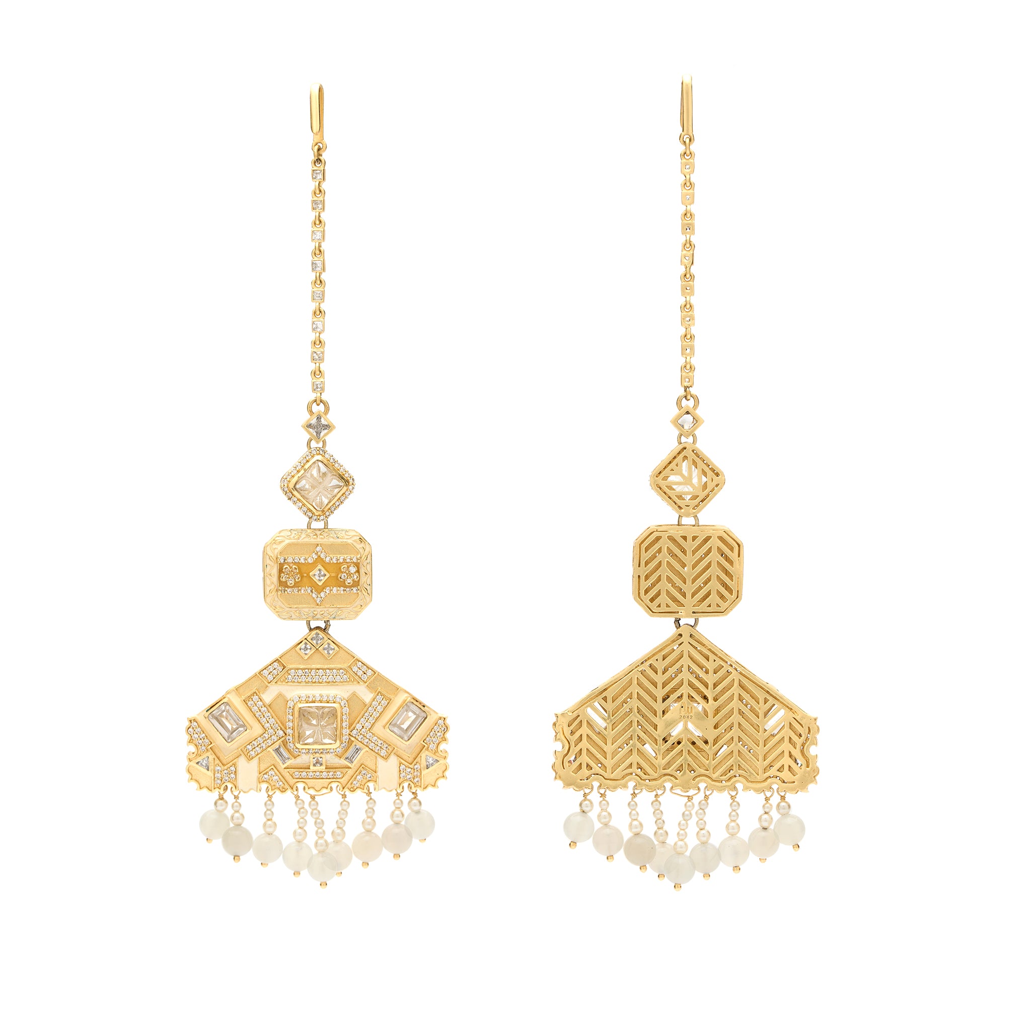 A stylized rendition of the traditional 'maang tika' -- this iconic head jewel features asymmetric patterns woven together, linearly. A medley of carved and unfaceted ivory semi-precious stones, laced with high-grade zirconia add to the richness of this jewel.