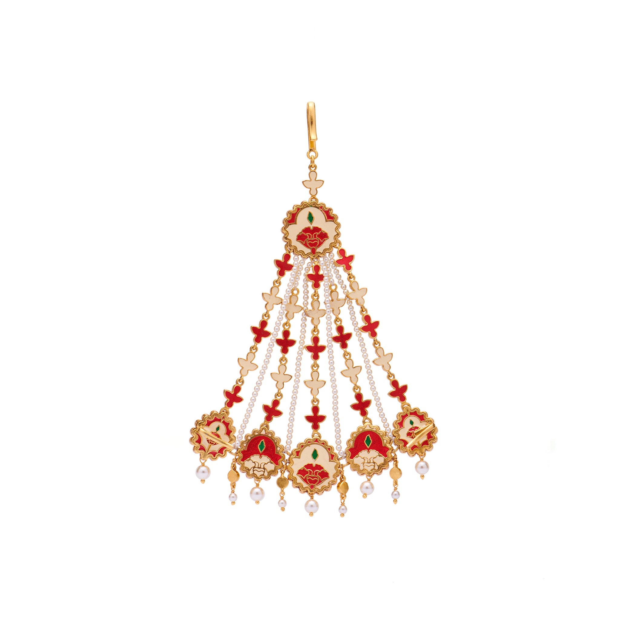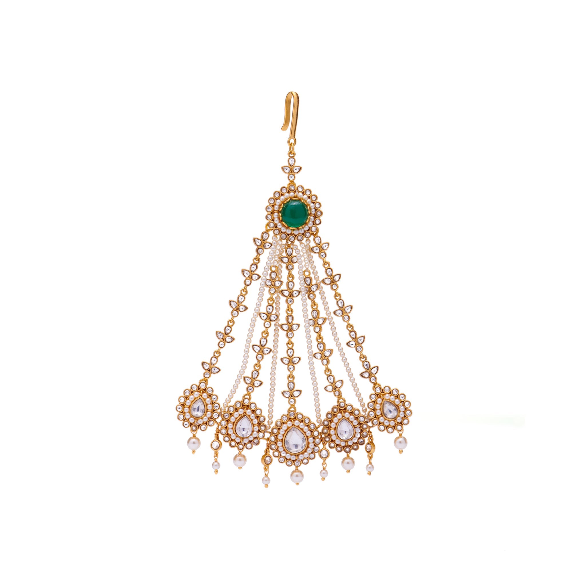 This traditional head jewel has cascading strings which features meticulously chosen carved green semi-precious stones, laced with kundan work. The decadent design detailing juxtaposed with smooth lines and sharp edges makes this an iconic piece of jewelry.