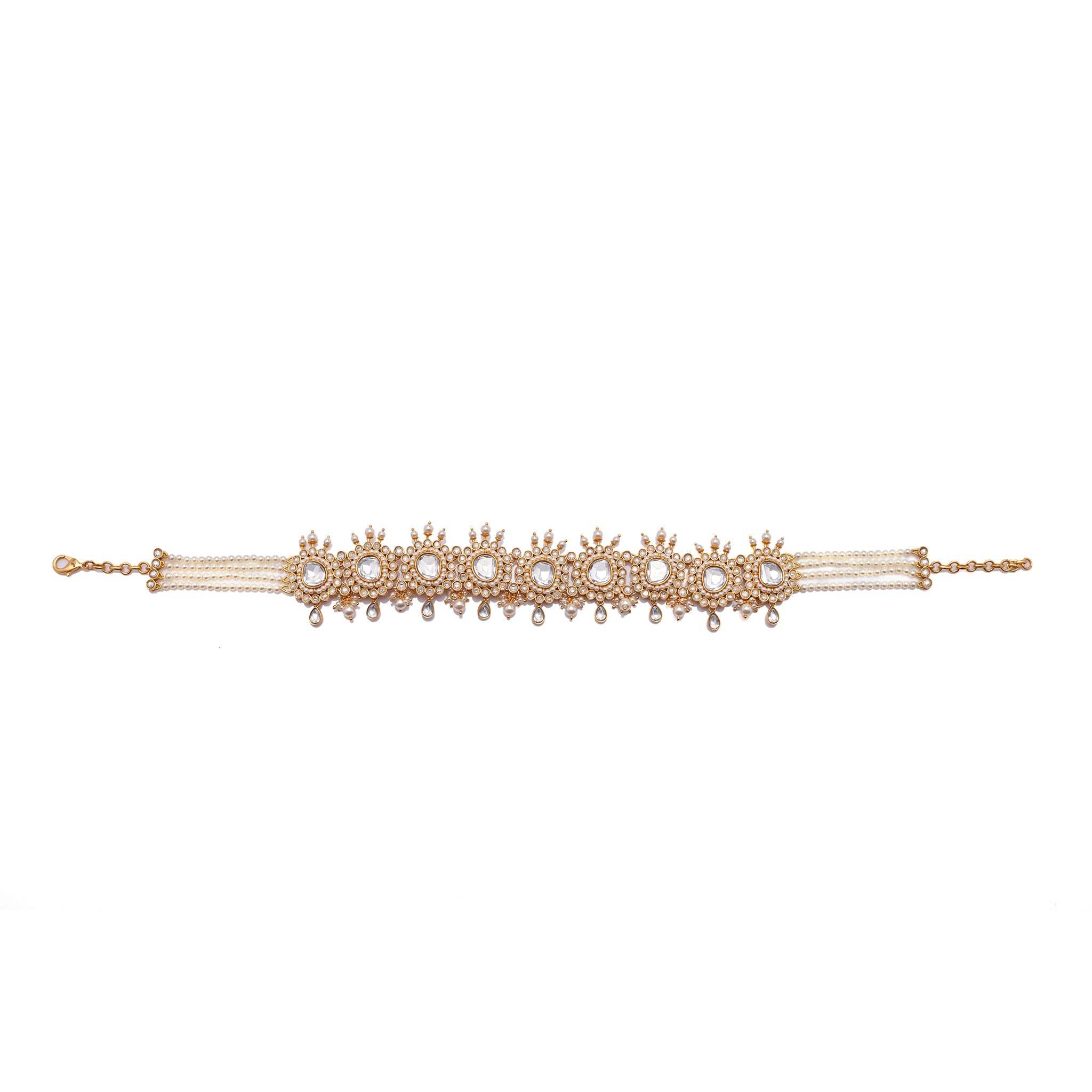 This choker strings together a cluster of round shaped Kundan stones that's playfully accentuated by a conglomeration of Pastel Plum pearls. The dreamy Kundan work in the front complements the stunning enamel work at the back of the jewel.