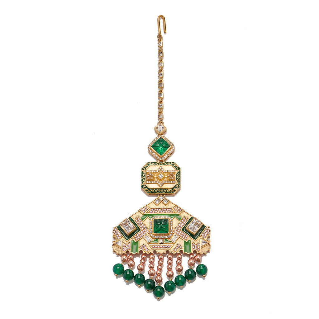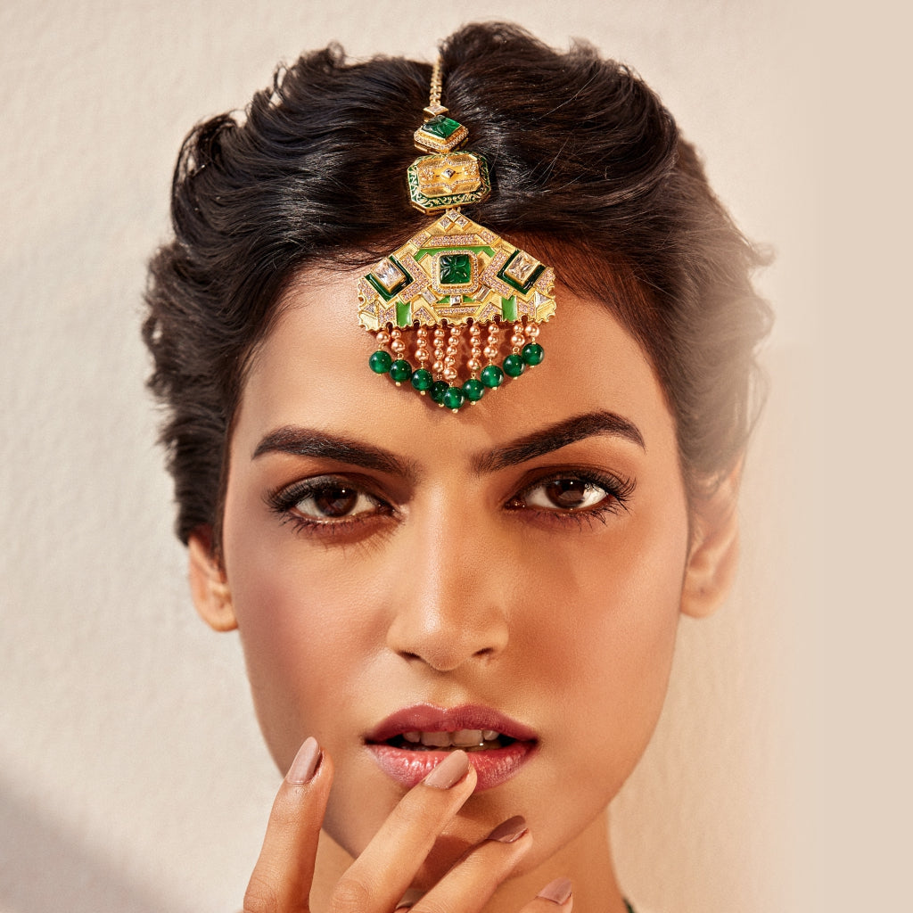 A stylized rendition of the traditional 'maang tika' -- this head jewel features asymmetric patterns woven together in a linear way.