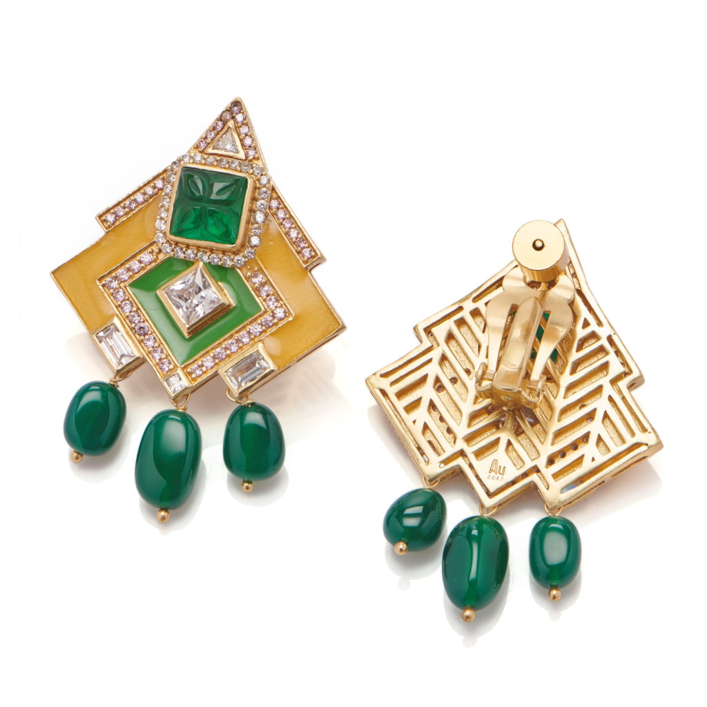 A union of edgy geometric design and intricately carved motifs in bold carved green semi-precious stones surrounded by rich enameling sets these earrings apart.