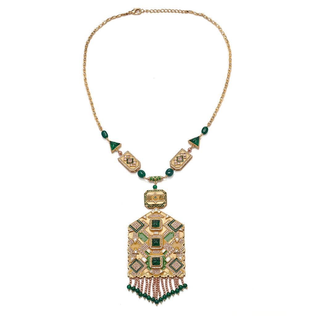 The striking symmetry of this angular necklace is enhanced by the unorthodox combinations of carved green semi-precious stones (53.5 carats), Swarovski pearls, and high-grade zirconia set in enamel.