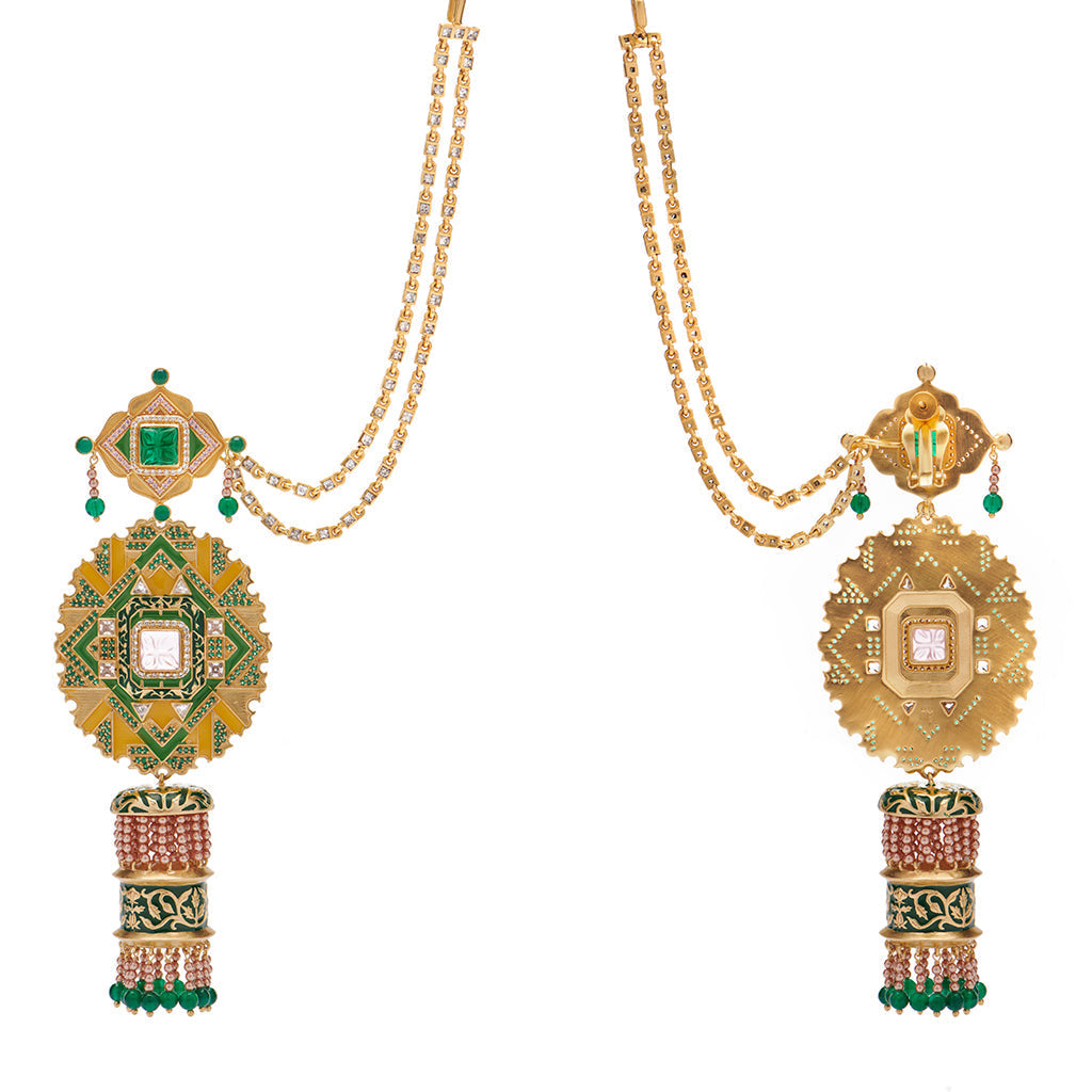 A stylized rendition of the classic chandelier earrings, this statement jewelry piece features geometric patterns bejeweled with semi-precious stones just under 48 carats, evoking a sense of vintage nostalgia.