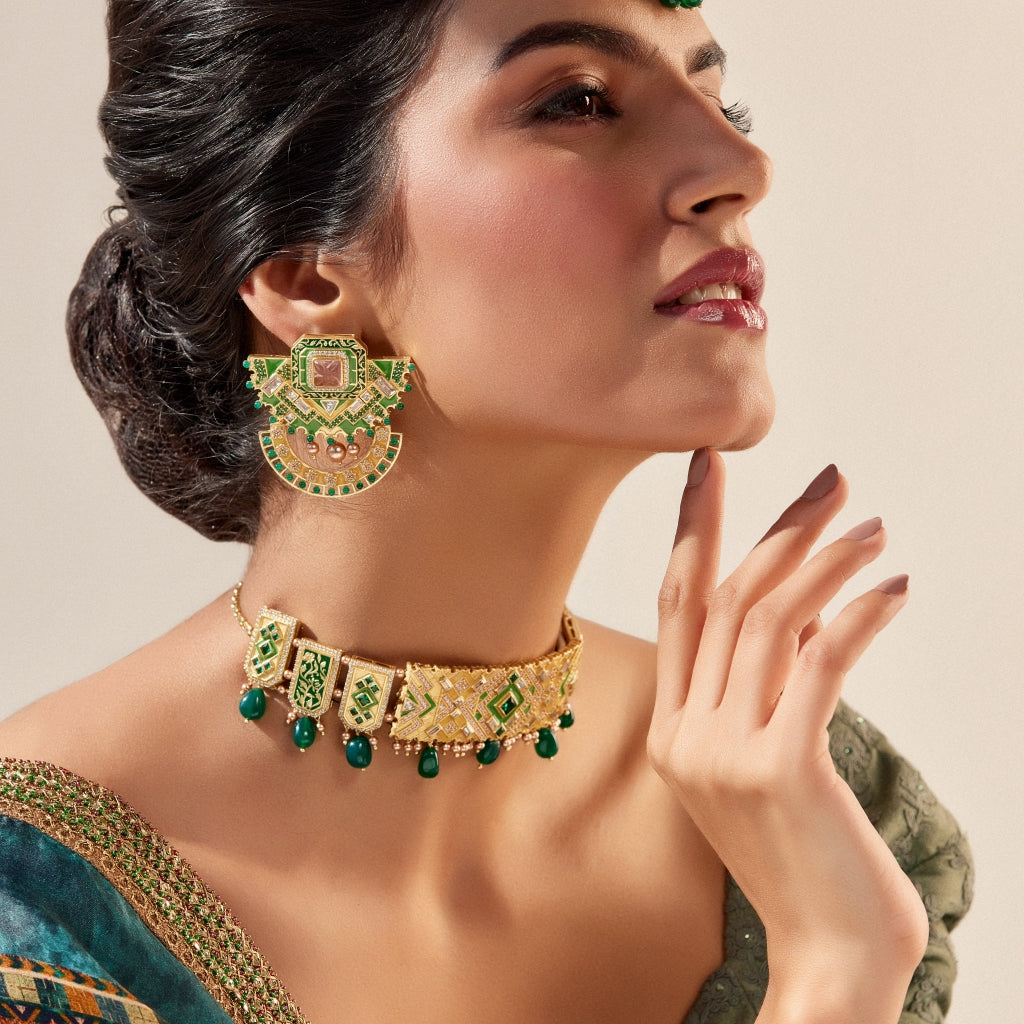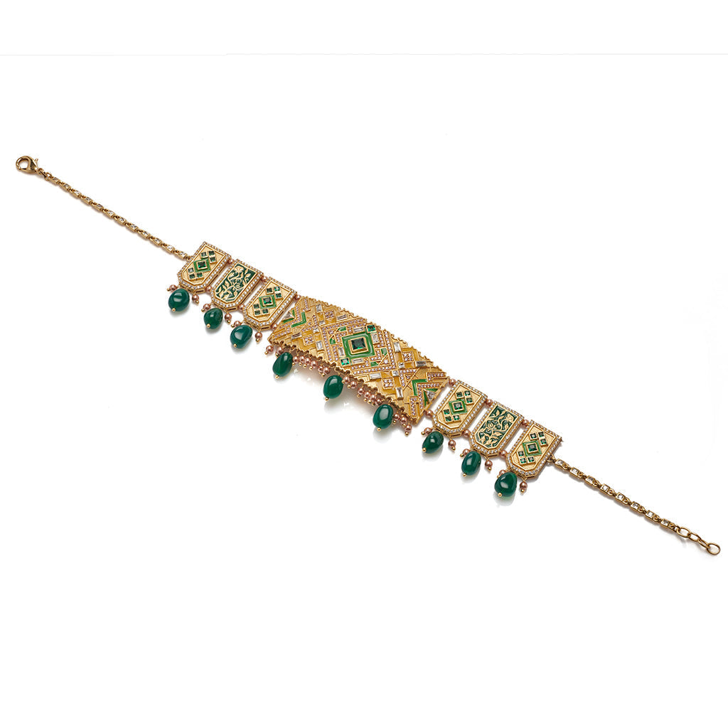 This sculpted choker is a union of edgy geometric form and intricately carved motifs featuring green semi-precious stones, with rich and delicate enamel detailing.