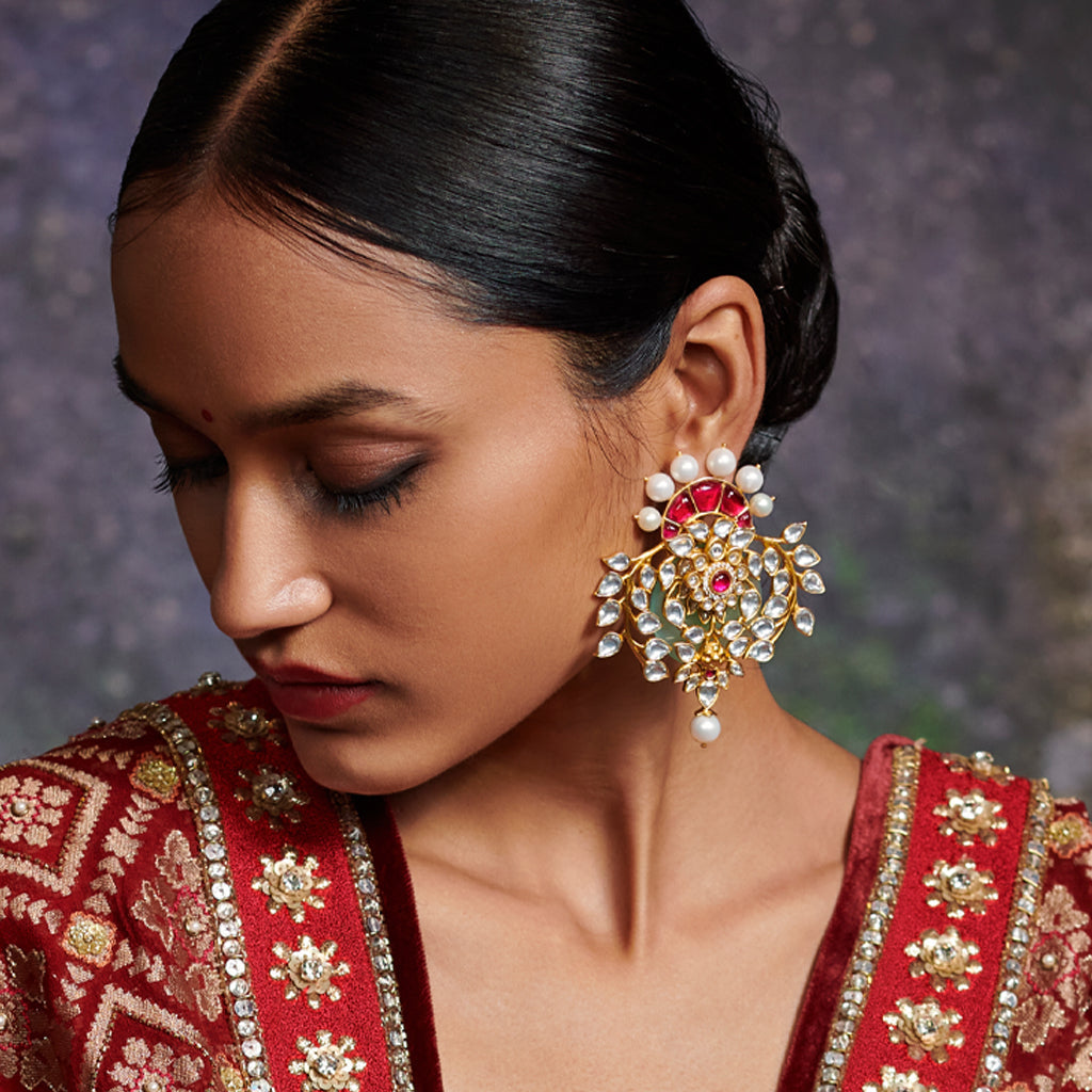 Carefully curated traditional motifs crafted with 93.5 carats of meticulously chosen crimson semi-precious stones, along with high-grade zirconia-kundan stones set in a contemporary design aesthetic.