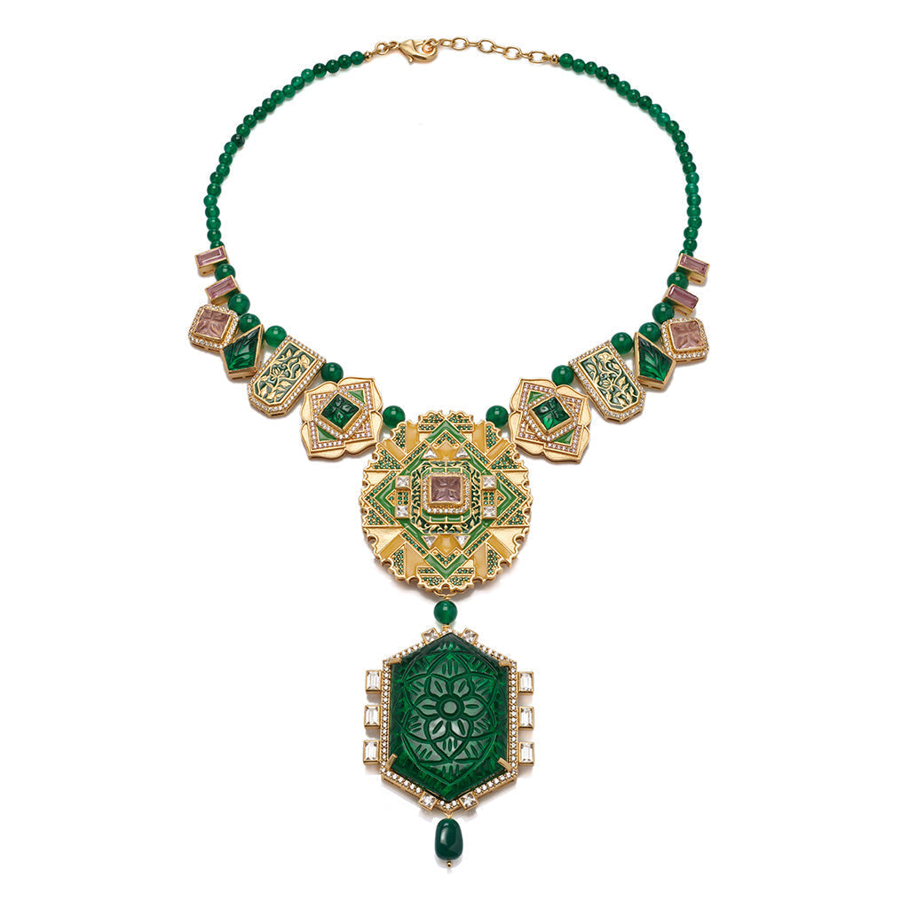 This long art-deco statement necklace centers upon a meticulously carved semi-precious green stone surrounded by rich enamel work, and semi-precious carved stones. The symmetrical design of the necklace has been replicated on the reverse as well, adding a new depth to it.