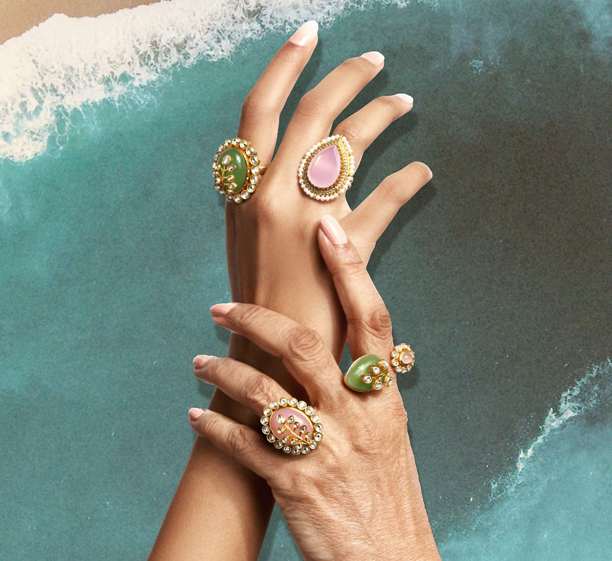 We create semi-precious sustainable jewelry exclusively, in partnership with leading Indian designers - meticulously crafted by the finest artisans, using recycled metals (and gold-plated) and engineered for lifetime durability.