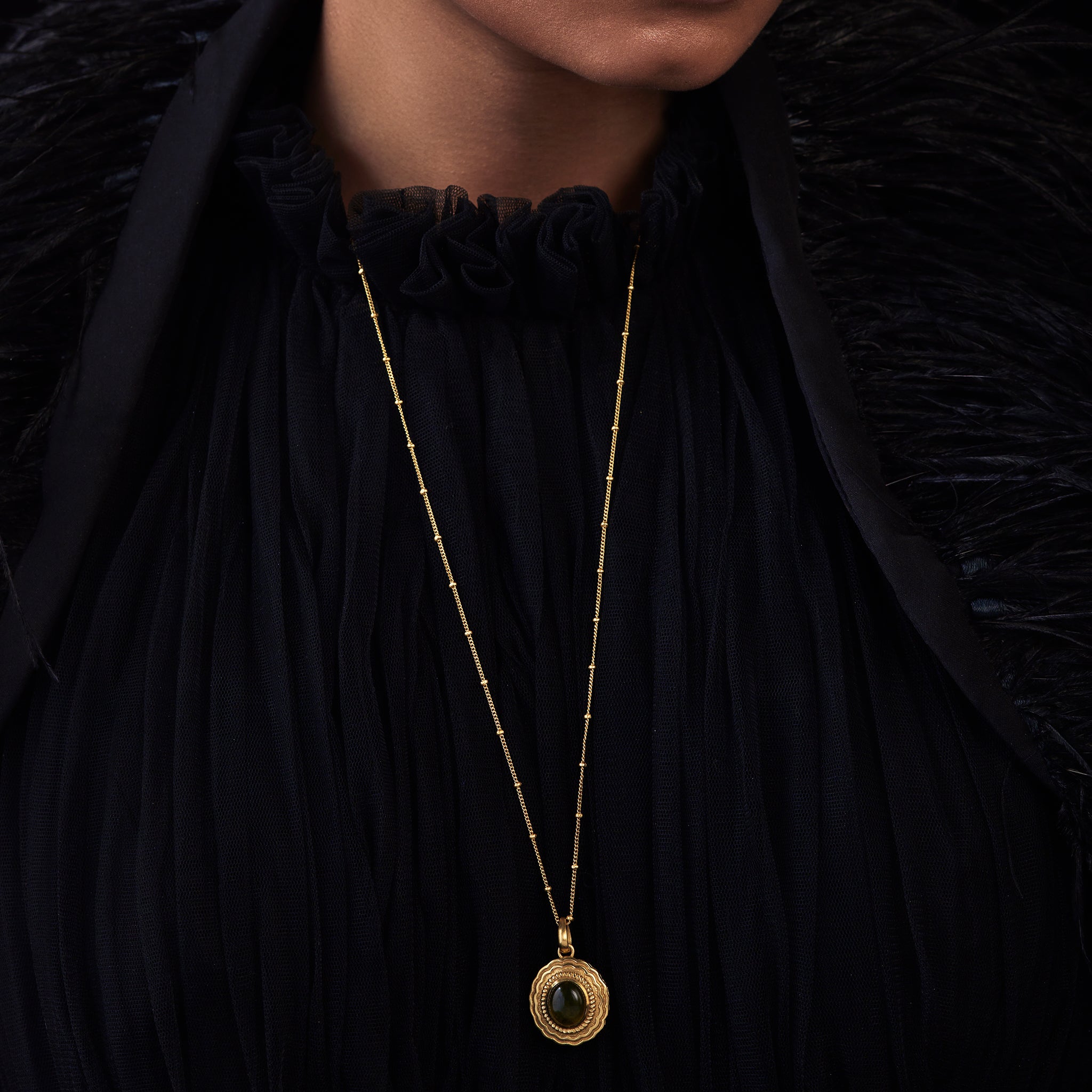 The EssenceThis chic necklace features a hand-picked green jade stone set on a carved circular golden disc. Additionally, the decadent design detailing of the chain makes this an iconic piece of jewelry. Consciously MadeYou are avoiding the generation of approximately 17,500 kg of toxic waste & 300 kg of CO2 emissions, that mining gold for this jewel would have caused.