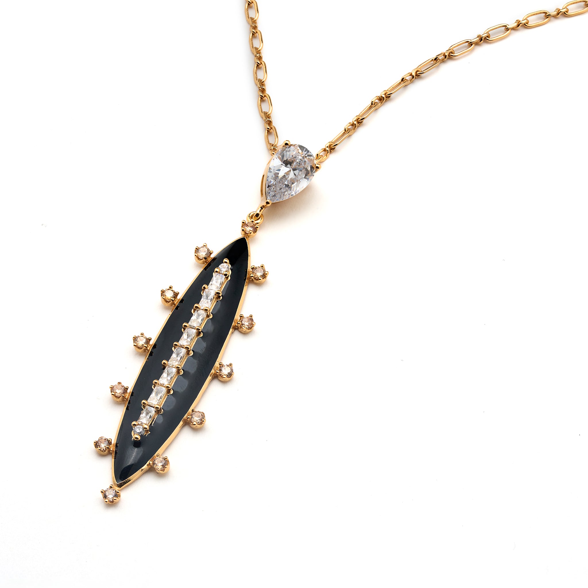 The oval-shaped pendant is dotted with stones like sparkling high-grade zirconia stones and is outlined with enamel work.