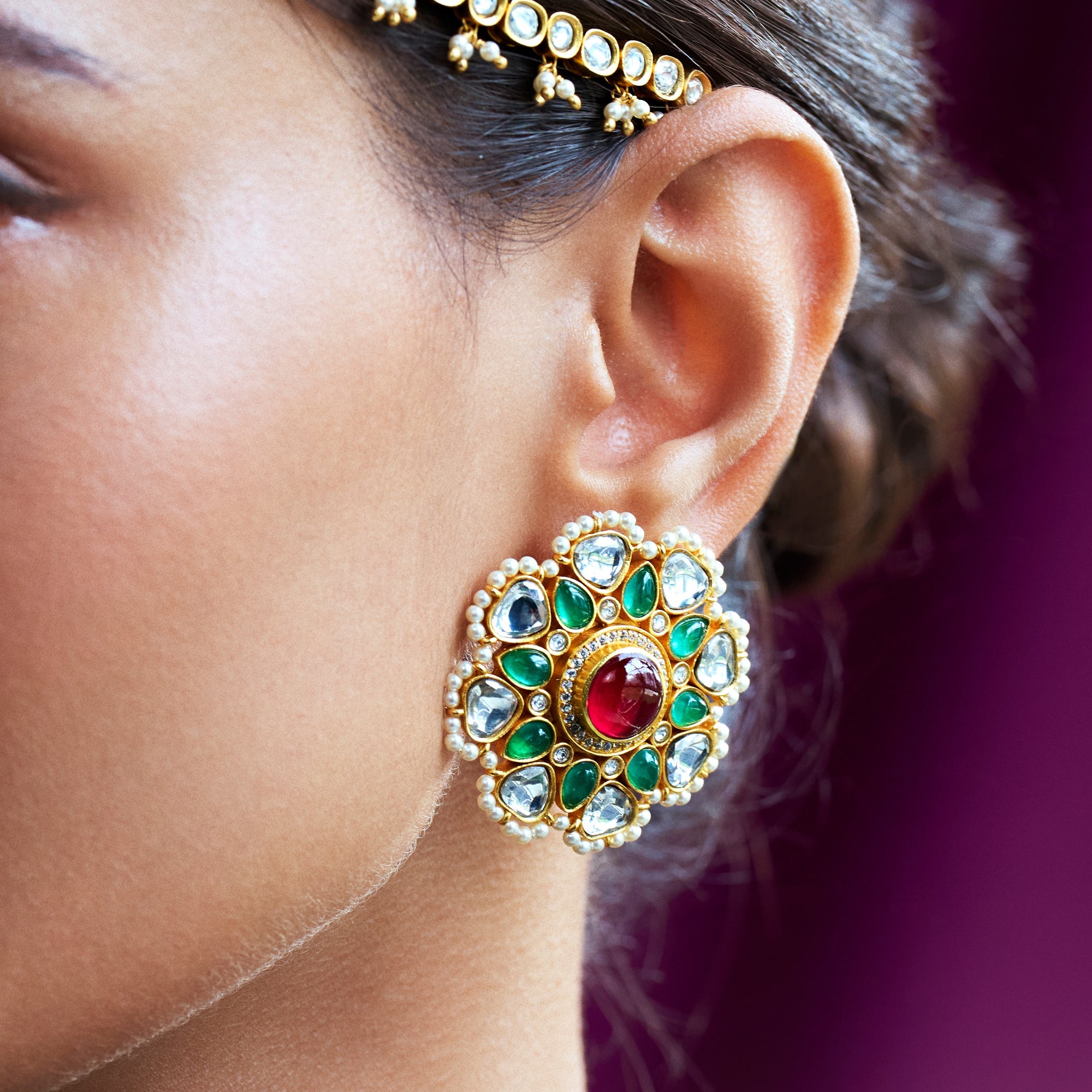 A modish duo of crimson & green semi-precious stones, unfaceted zirconia-kundan stones and Swarovski pearls makes this pair of studs a lust-worthy jewel for all. The traditional enamel work at the back of the earrings adds a layer of elegance to this jewel.