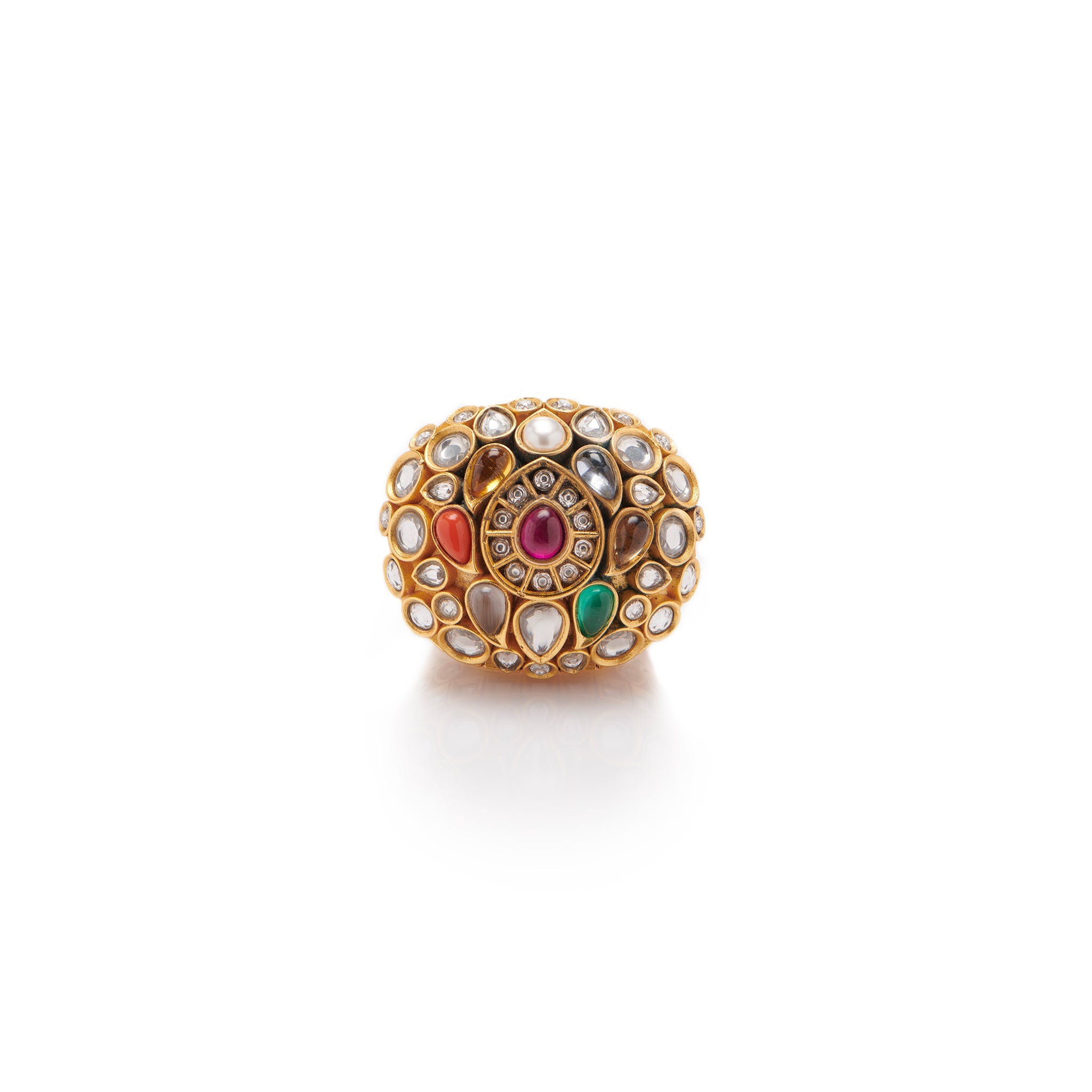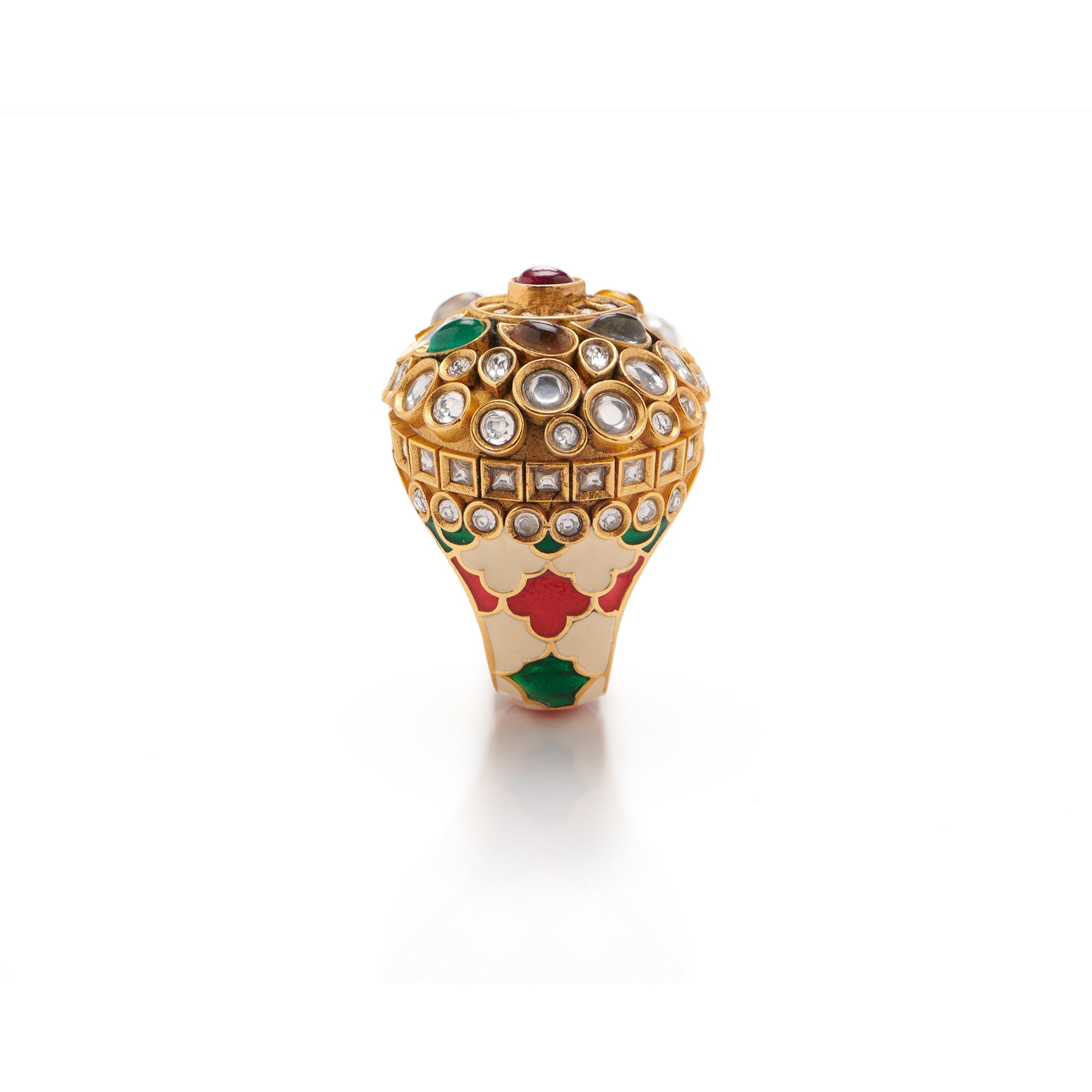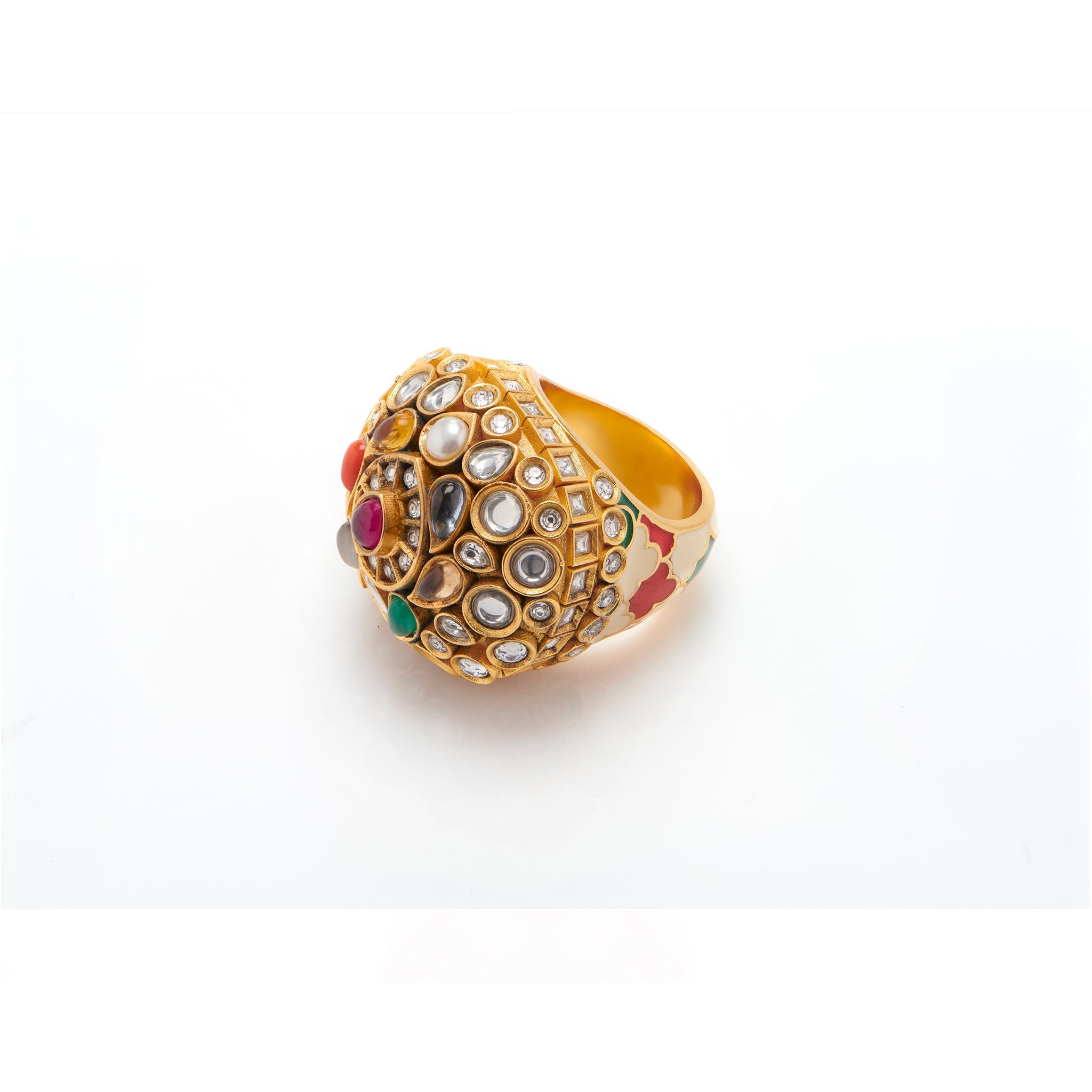 This statement ring crafted with a melange of semi-precious stones, studded in kundan work, is an iconic hand jewel that can be worn with both ethnic and western wear. The traditional meenakari work at the back of the ring elevates its majestic appeal.