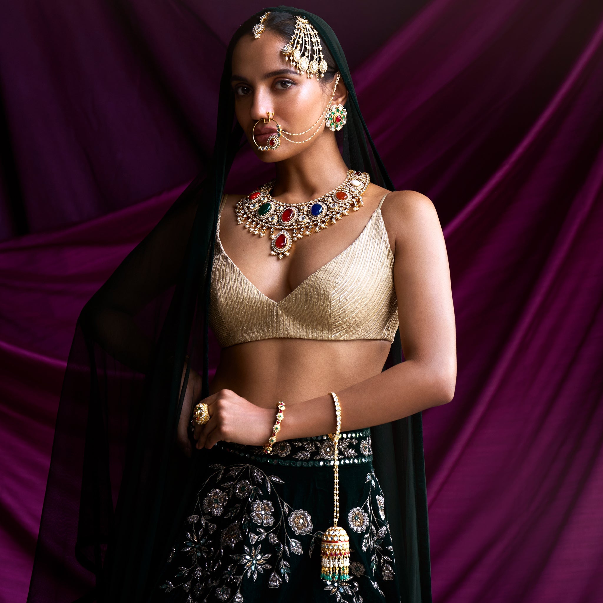 Inspired by the design sensibilities of the Mughal era, this pair of Kaleeras symbolize timelessness and romance. Choicest semi-precious stones come together to create this glorious piece of jewelry.