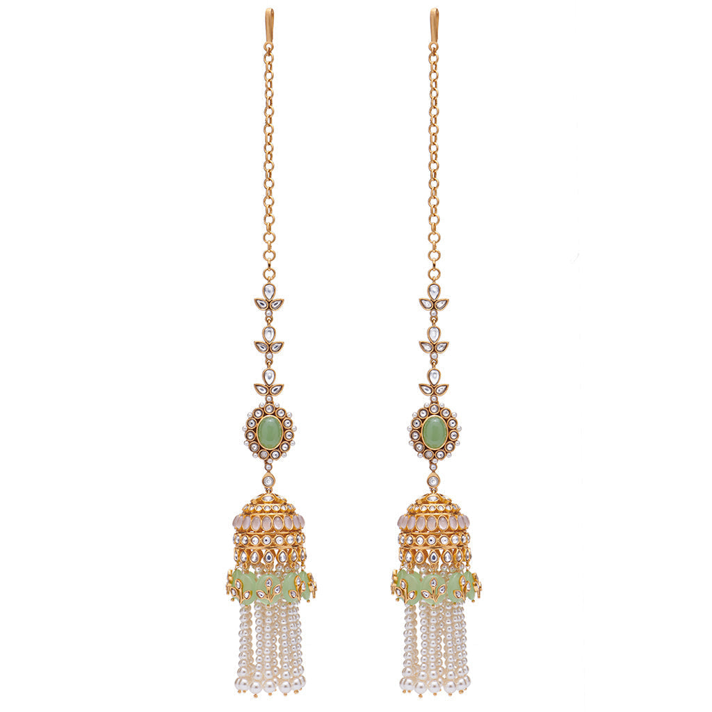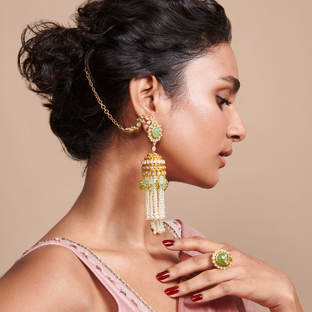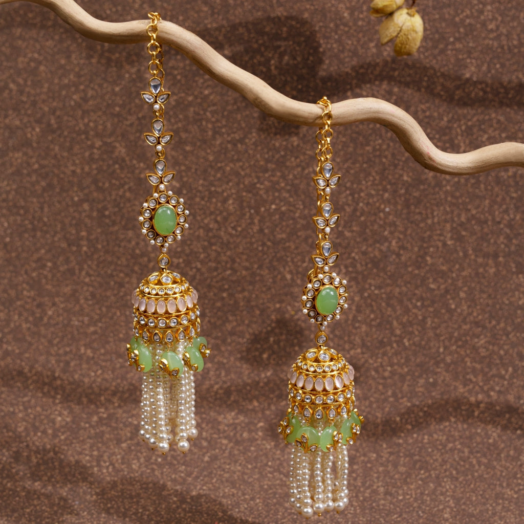A magical world of fantasy and dreamy storytelling comes alive in this pair of ornate drop earrings with soft pink and pastel green semi-precious stones over 74 carats, set amongst brilliant Kundan work.