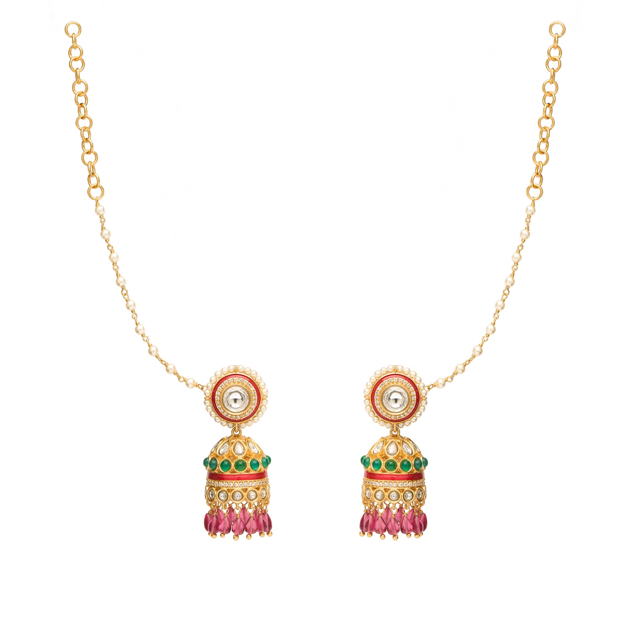 Inspired by the design sensibilities of the Mughal era, this pair of earrings symbolize timelessness and romance. Consciously made stones: high-grade unfaceted zirconia, crimson and pastel semi-precious stones.