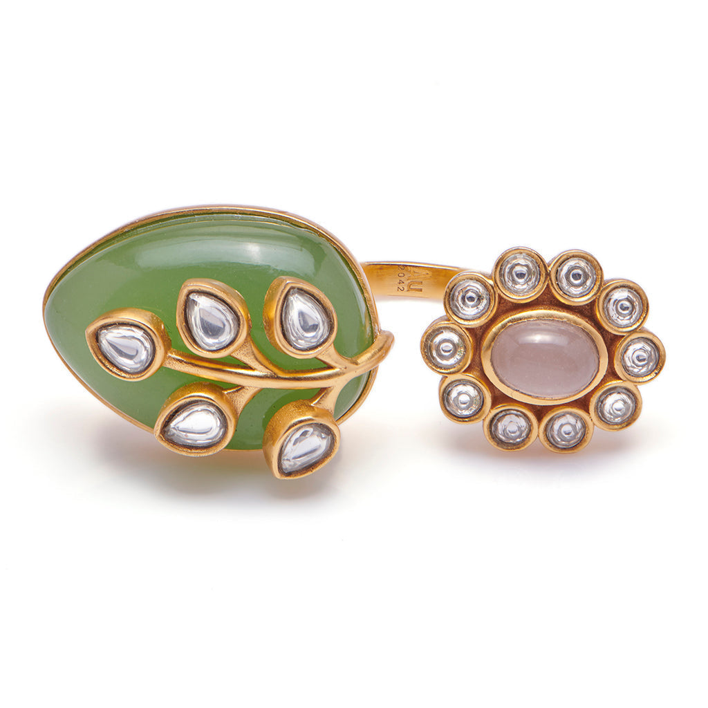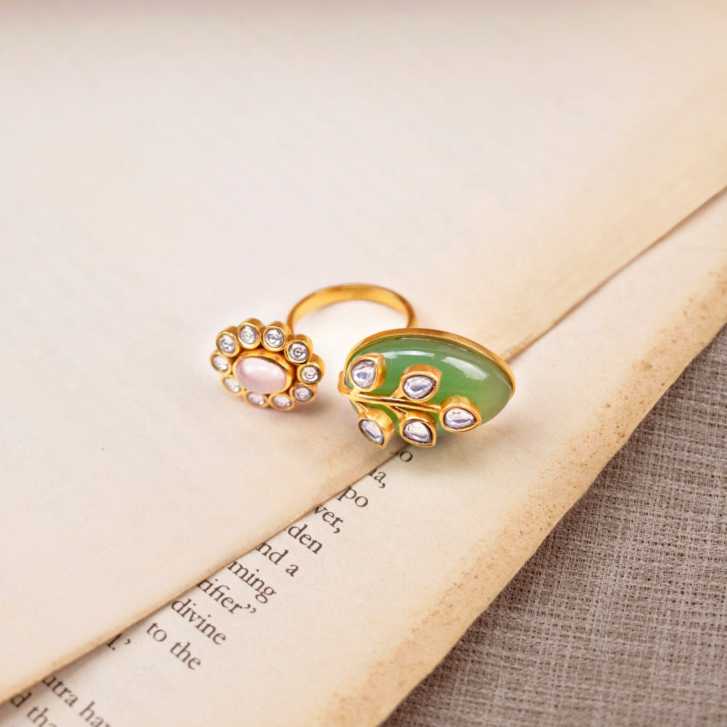 This in-between finger ring is crafted with dainty pastel-hued stones of over 13 carats to bring the flower and leaf motif to life.
