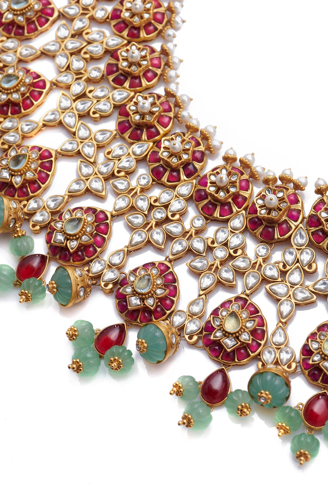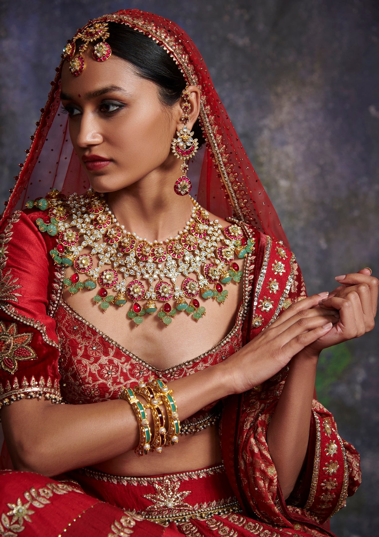 This exquisite bridal suite of semi-precious romantic reds symbolizes new beginnings. The pièce de résistance is an intricate lattice of synthetic pearls, dazzling crystals, and crimson-hued stones of over 577 carats.