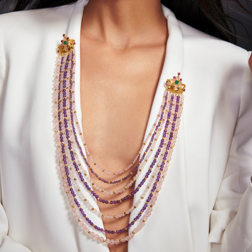 Cascading strands of pastel-hued beads joined together to create a versatile jewel that can adorn your outfits in multifarious ways.