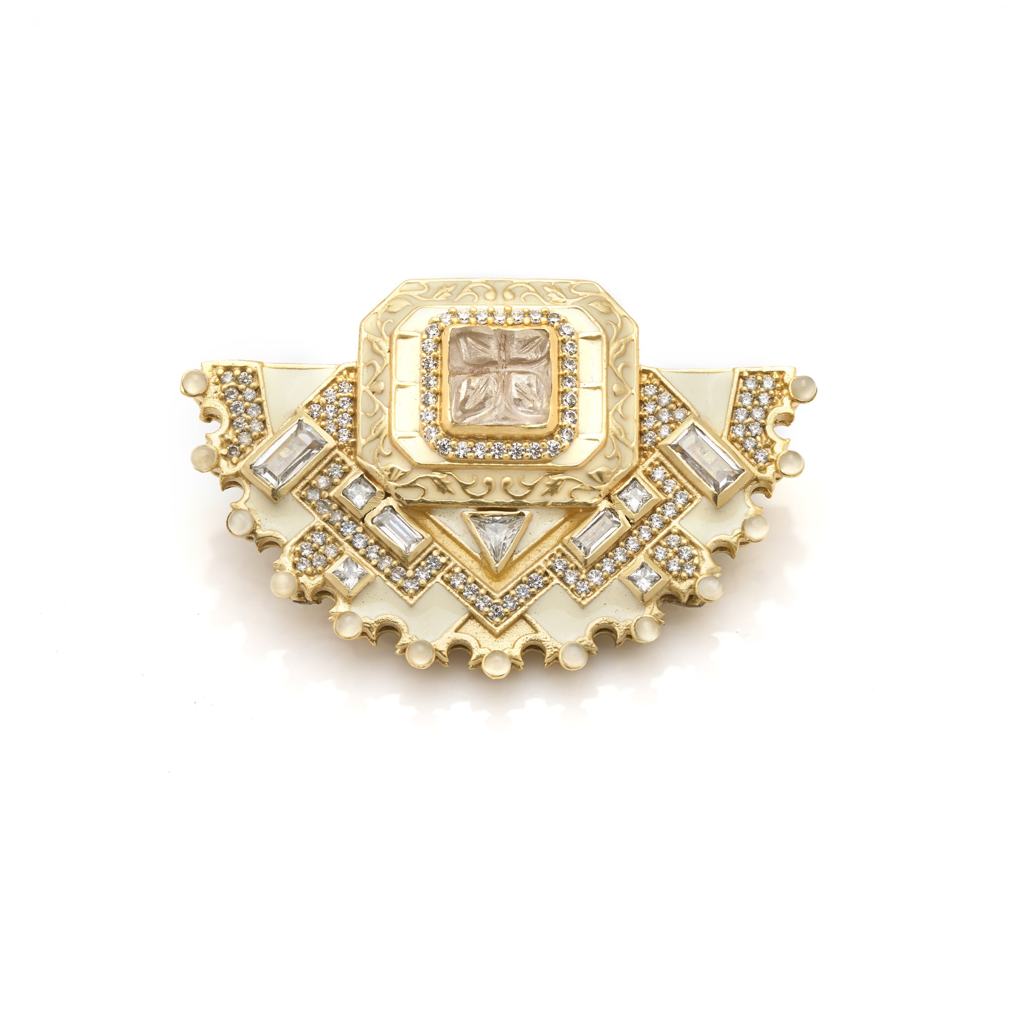 This Art-deco inspired unisex brooch is made of carved semi-precious stones, lined with high-grade zirconia. The chic enamel work further accentuates the design language of the jewelry.