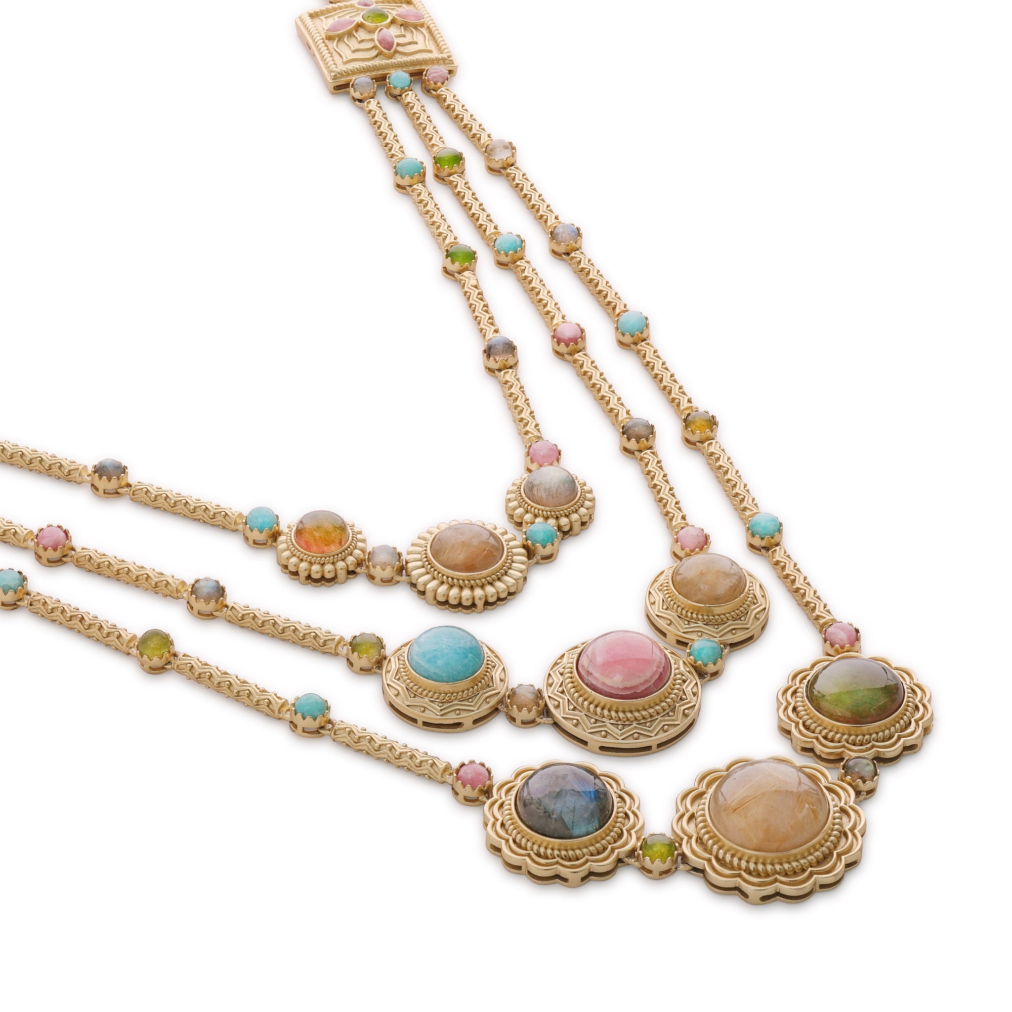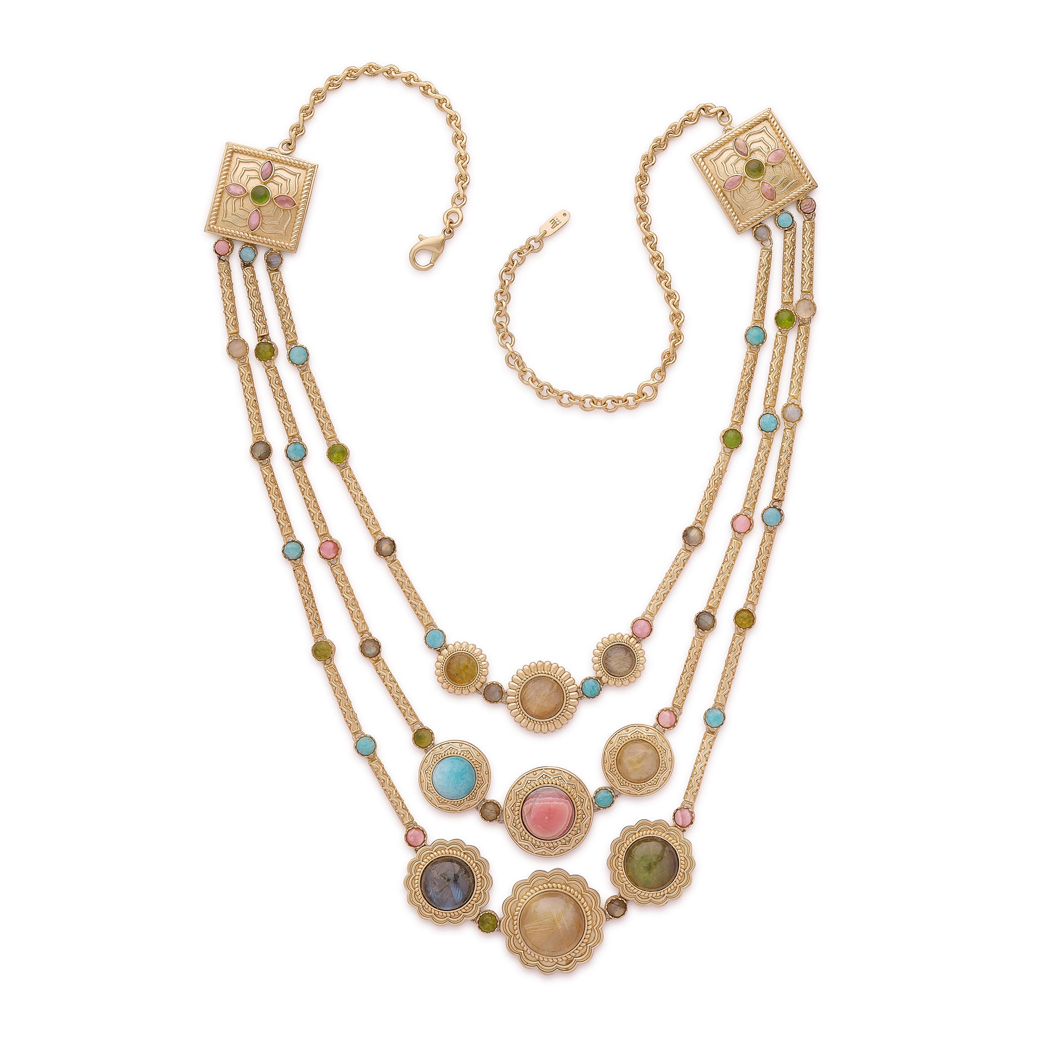 The EssenceThis layered necklace features a unique combination of stones like amazonite, labradorite, rhodochrosite, green jade, and golden rutile. The old-world-charm design aesthetic makes it an inherently opulent accessory. Consciously MadeYou are avoiding the generation of approximately 3,13,000 kg of toxic waste & 5,400 kg of CO2 emissions, that mining gold for this jewel would have caused.