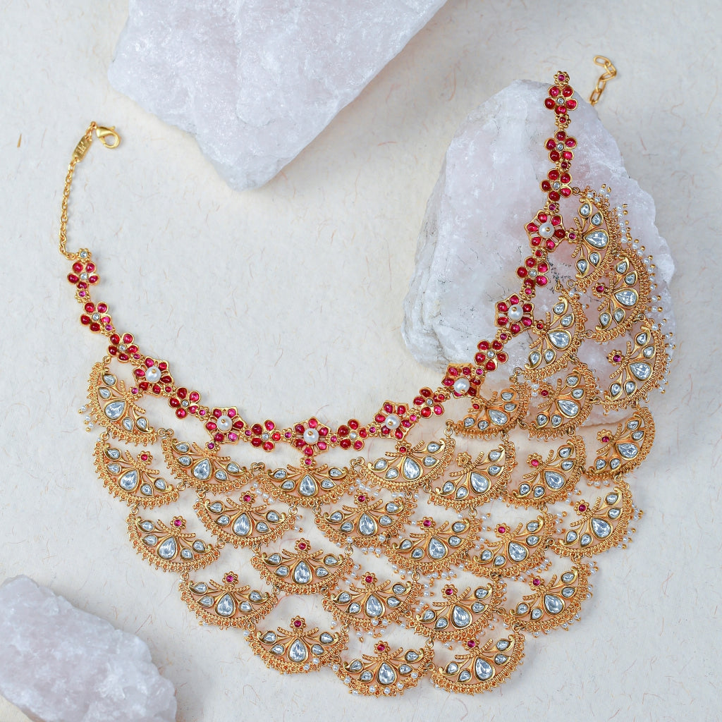 The EssenceGilded crescent motifs studded with brilliant white and deep-red stones of over 12 carats come together to create this quintessential bridal necklace. Pair it with the gilded crescent bridal earrings. Your ContributionYou are avoiding the generation of approximately 2,78,000 kg of toxic waste & 5,000 kg of CO2 emissions, that mining gold for this jewel would have caused.