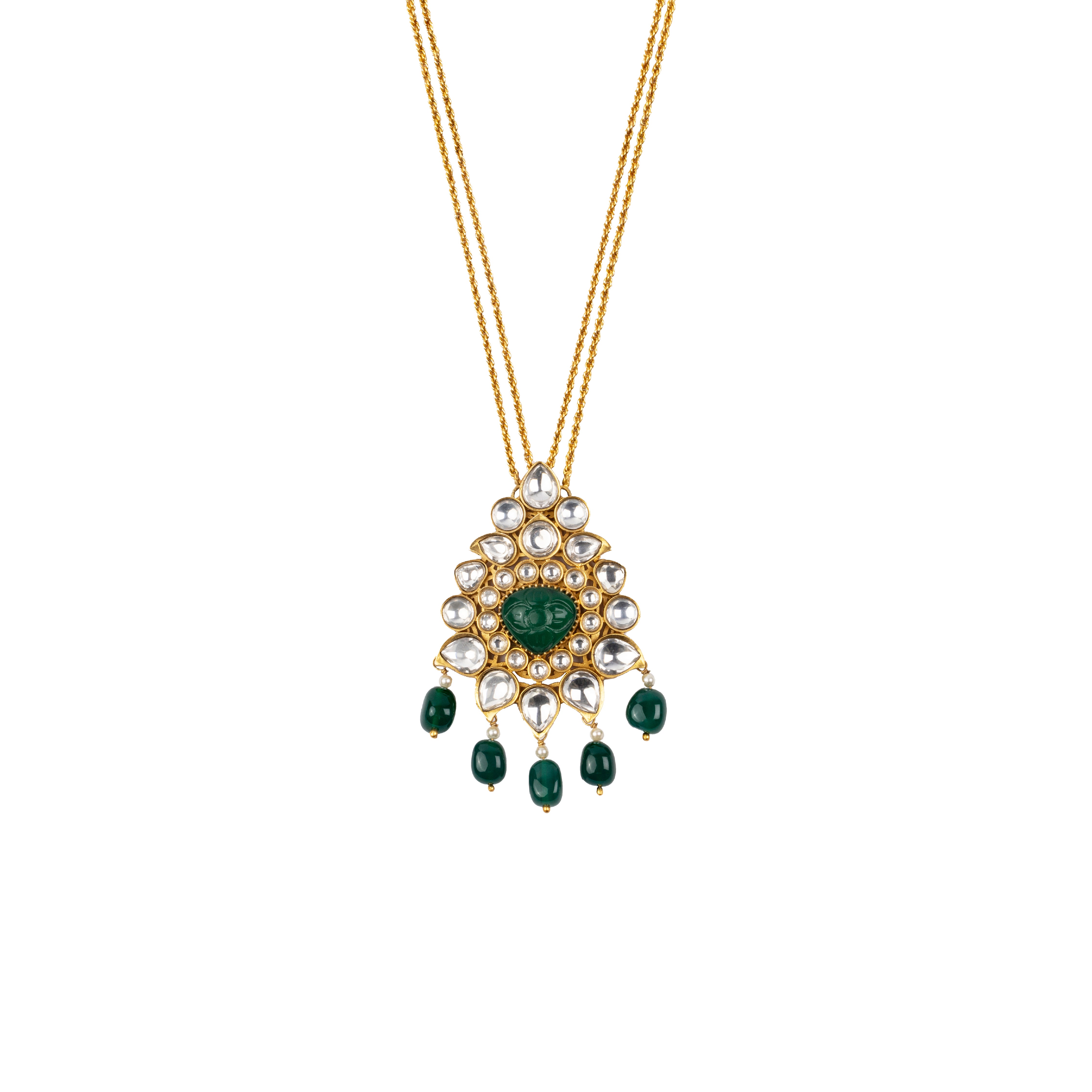 A symphony of emerald green stones dances across this majestic necklace, adorned with intricate kundan work.Consciously MadeYou are avoiding the generation of approximately 105272.4 Kgs of toxic waste & 1801.96 Kgs of CO2 emissions, that mining gold for this jewel would have caused.