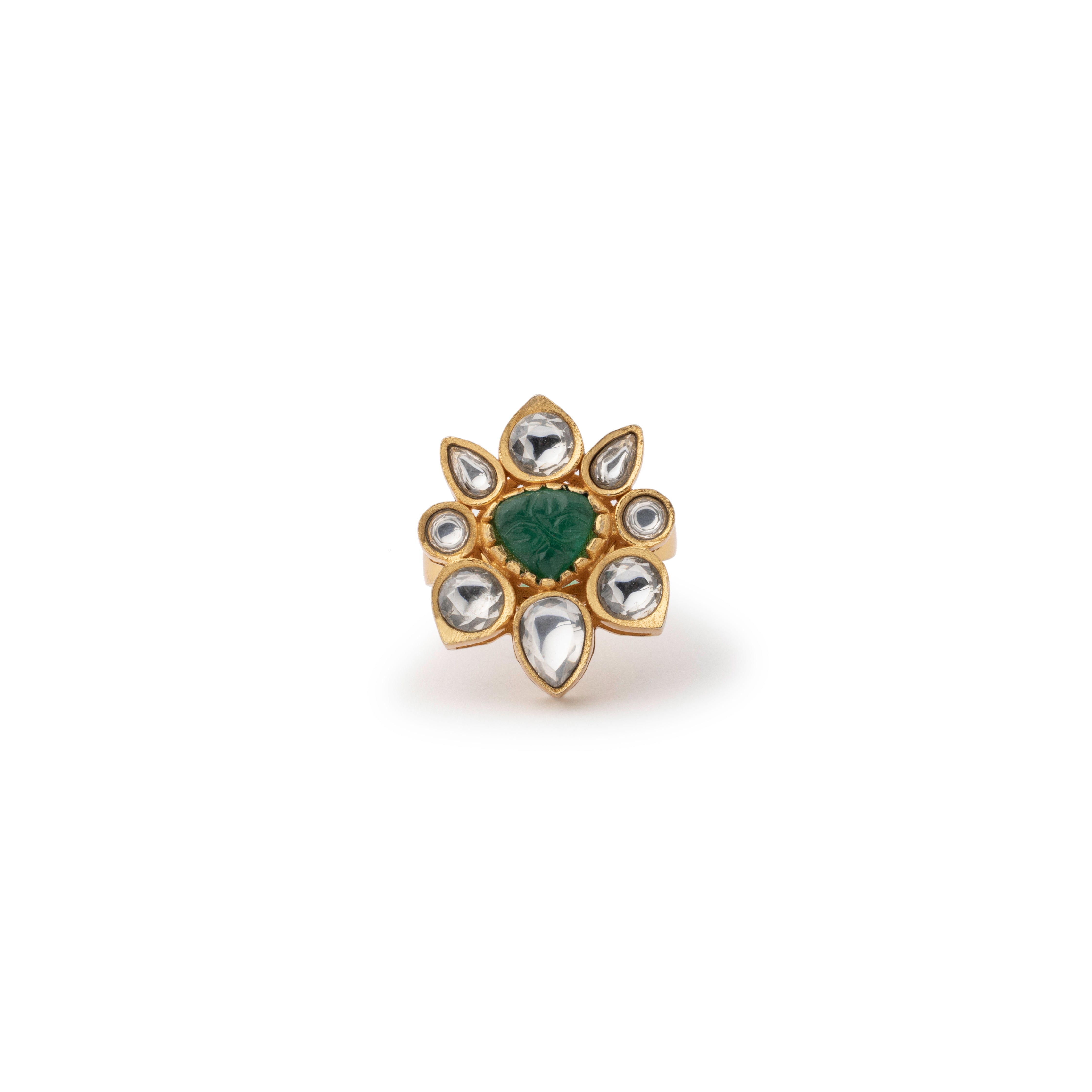 A statement floral ring adorned with a hand-carved semi-precious emerald green stone and intricate kundan work.Consciously MadeYou are avoiding the generation of approximately 18870 Kgs of toxic waste & 323 Kgs of CO2 emissions, that mining gold for this jewel would have caused.