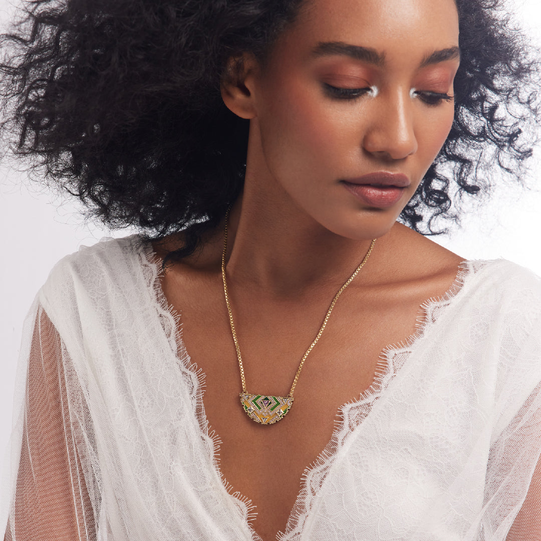A poetic interplay of a half-moon motif, intricate enamel work, and semi-precious stones makes this a truly exquisite necklace.