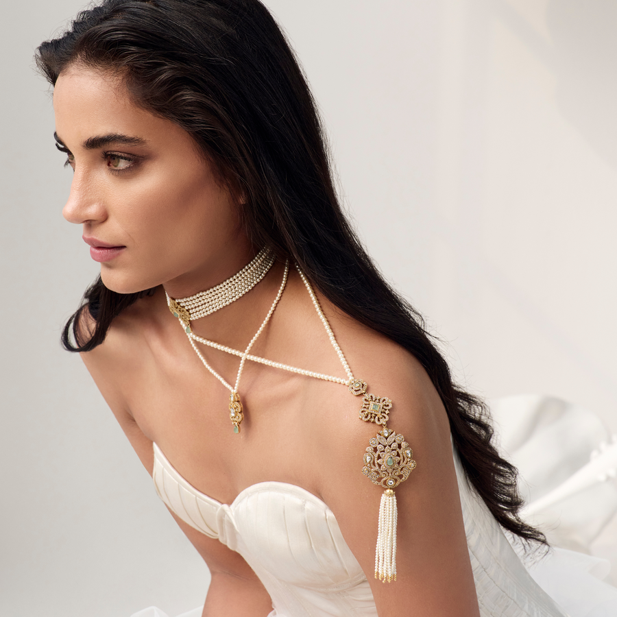 A whisper of the Mughal era's artistry and architecture graces this iconic Kundan necklace, where high-grade zirconia-kundan stones and strings of Swarovski pearls shimmer in exquisite harmony.Consciously MadeYou are avoiding the generation of approximately 55500 Kgs of toxic waste & 950 Kgs of CO2 emissions, that mining gold for this jewel would have caused.